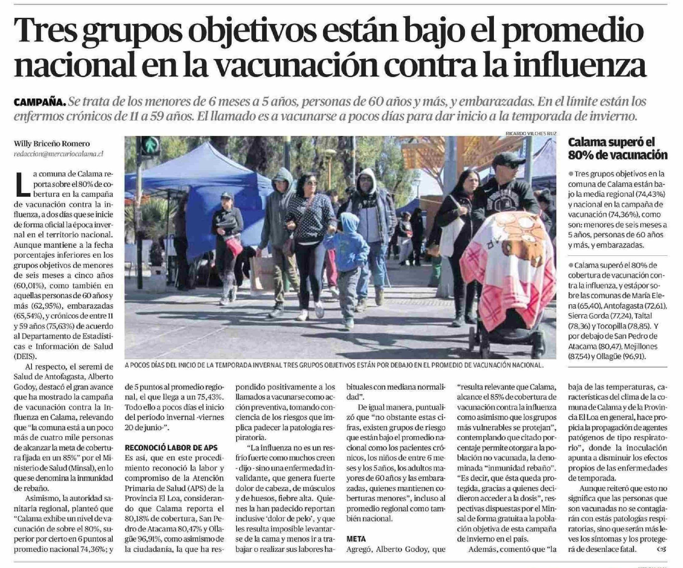 Tres grupos objetivos están bajo el promedio nacional en la vacunación contra la influenza 18-06-2025 El Mercurio de Calama |