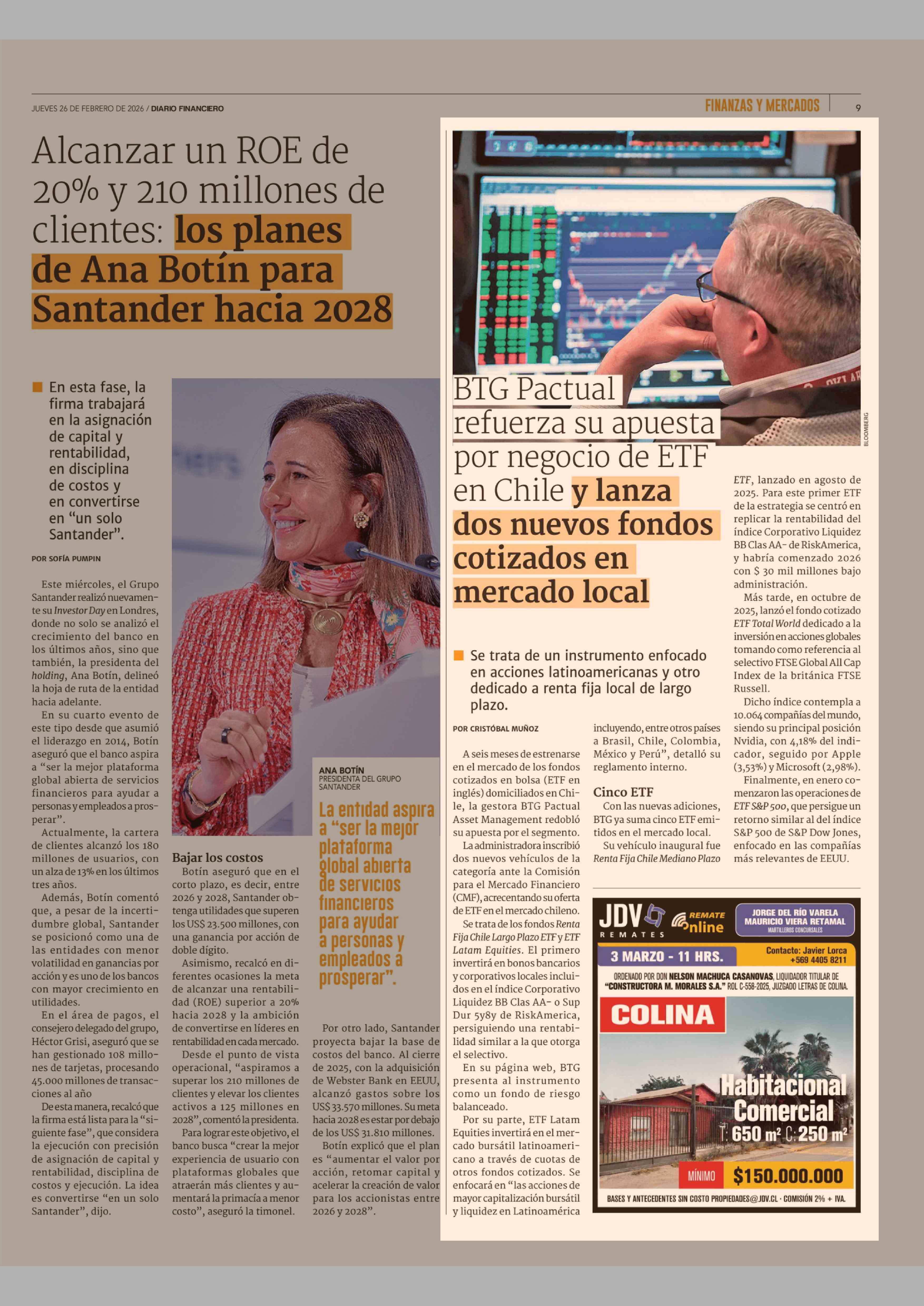 BTG Pactual refuerza su apuesta por negocio de ETF en Chile y lanza dos nuevos fondos cotizados en mercado local 26-02-2026 Diario Financiero |
