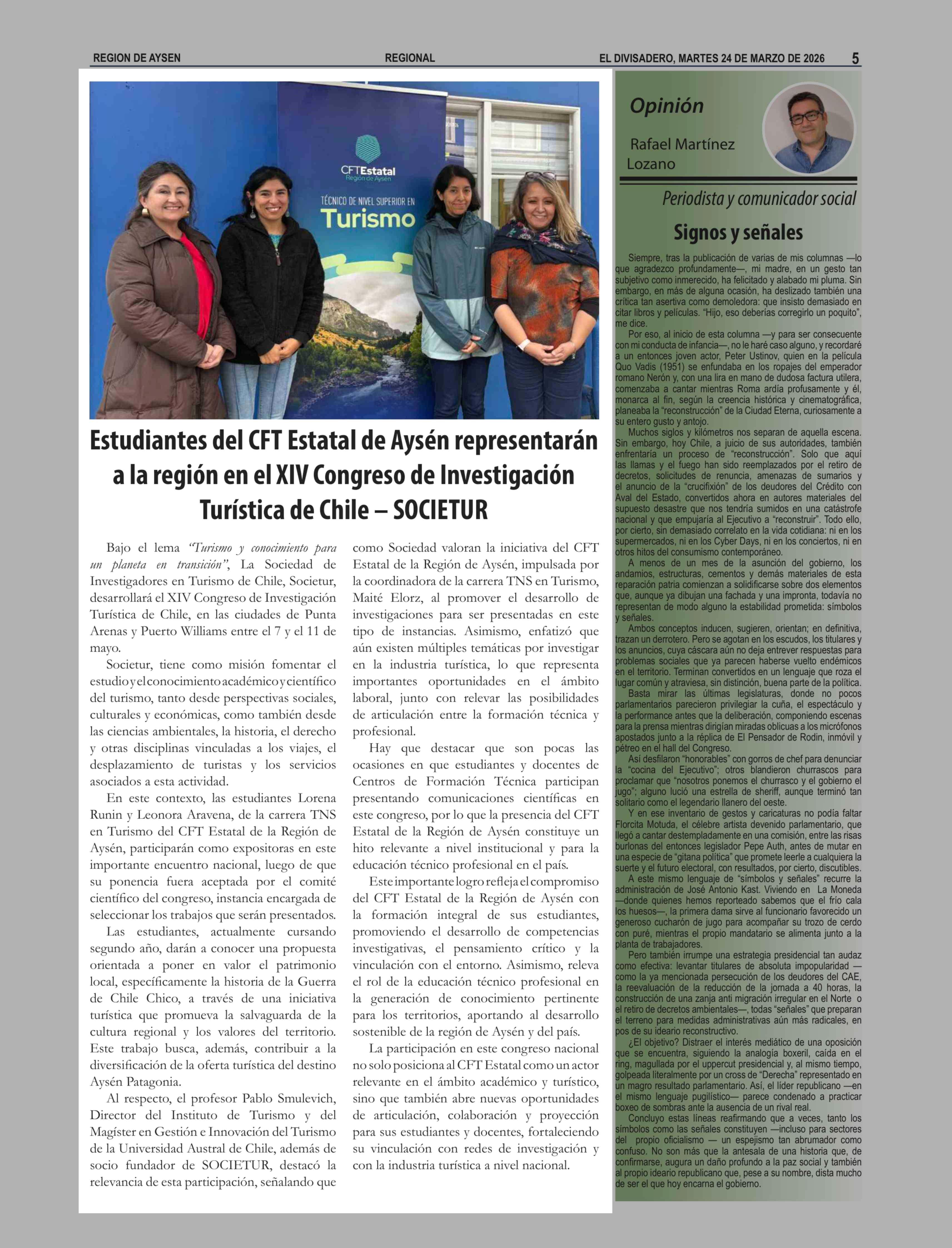 Estudiantes del CFT Estatal de Aysén representarán a la región en el XIV Congreso de Investigación Turística de Chile - SOCIETUR 24-03-2026 El Divisadero |