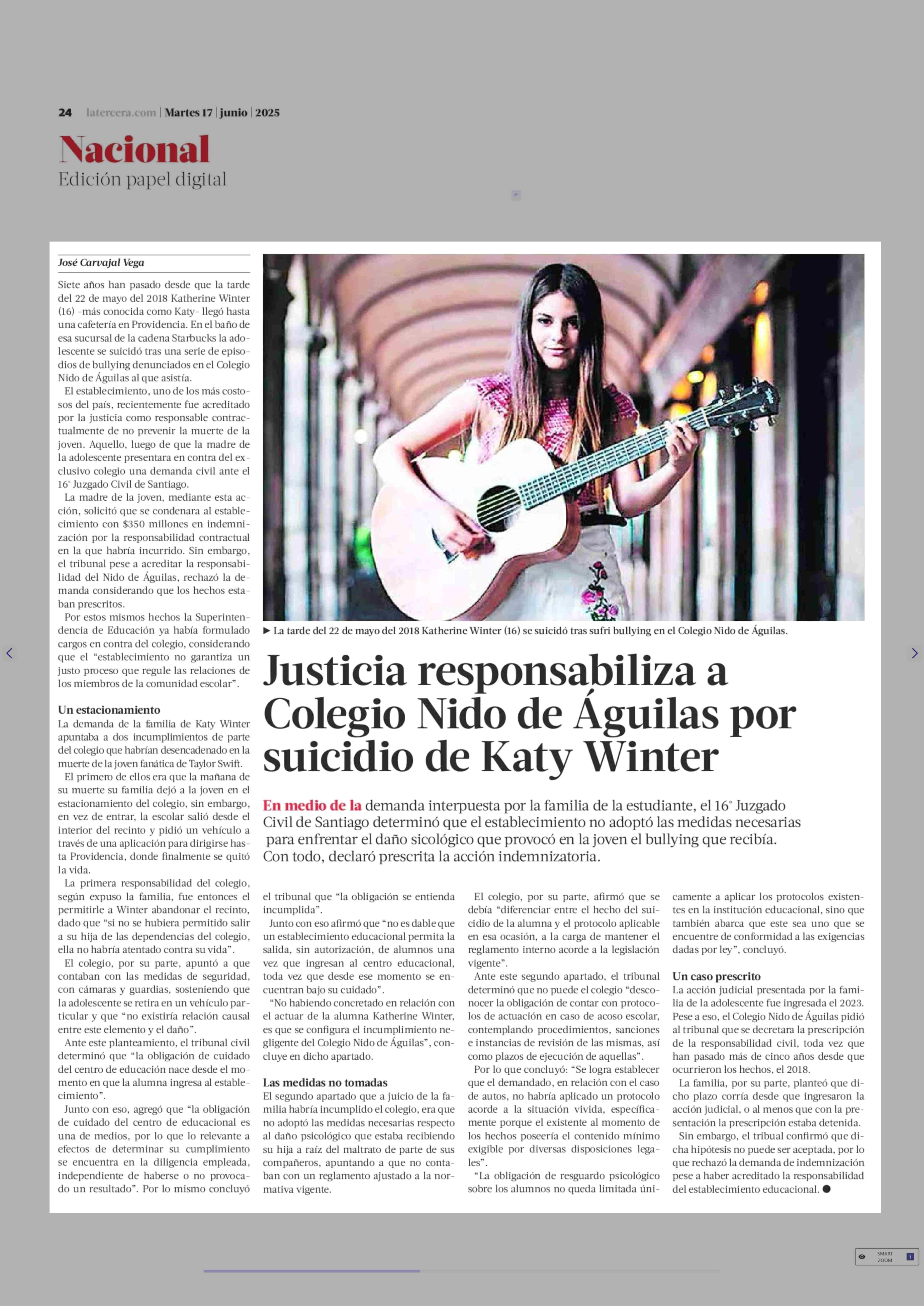 Justicia responsabiliza a Colegio Nido de Aguilas por suicidio de Katy Winter 17-06-2025 La Tercera |