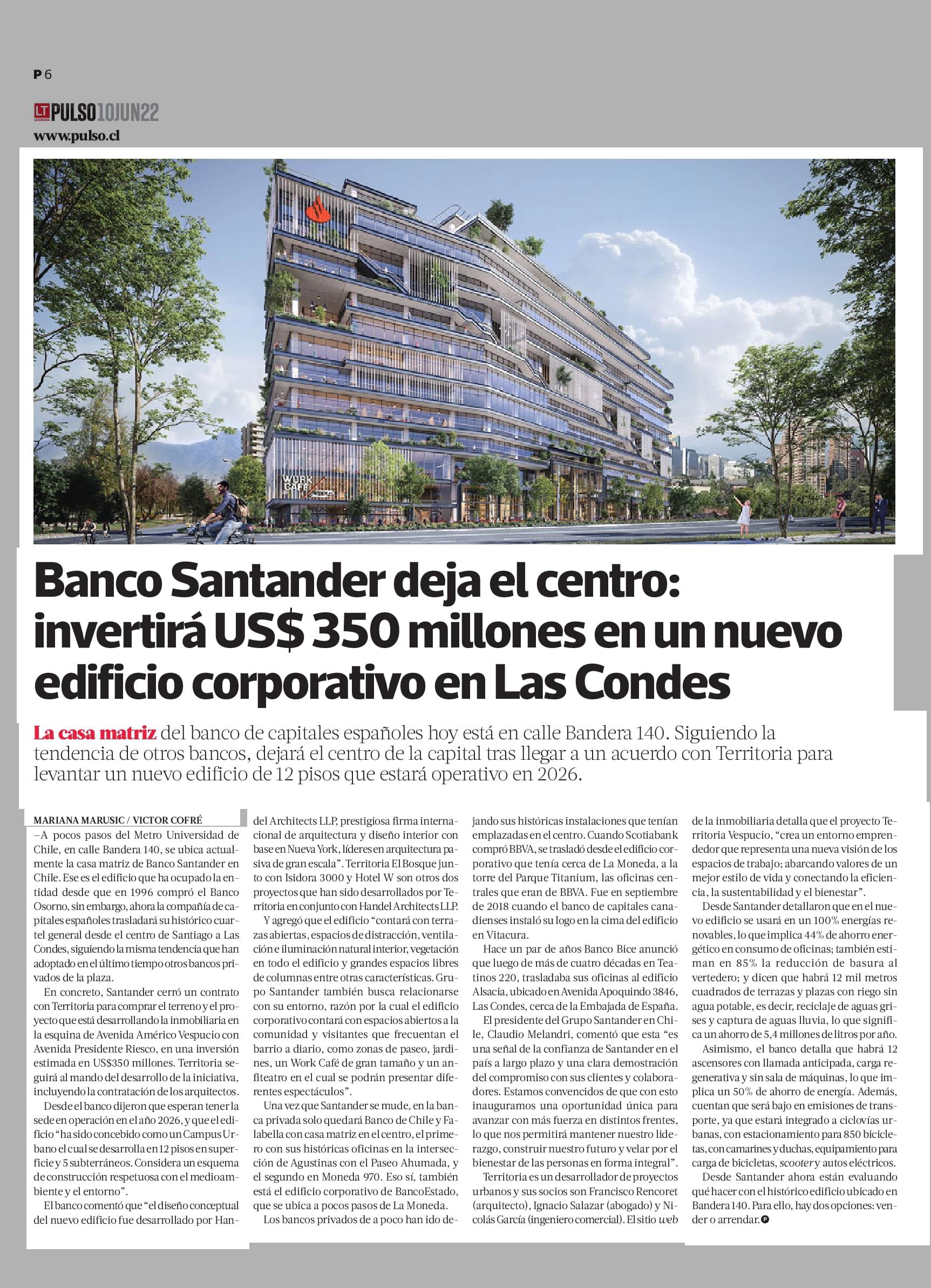 Banco Santander deja el centro: invertirá US$ 350 millones en un nuevo edificio corporativo en Las Condes 10-06-2022 La Tercera |