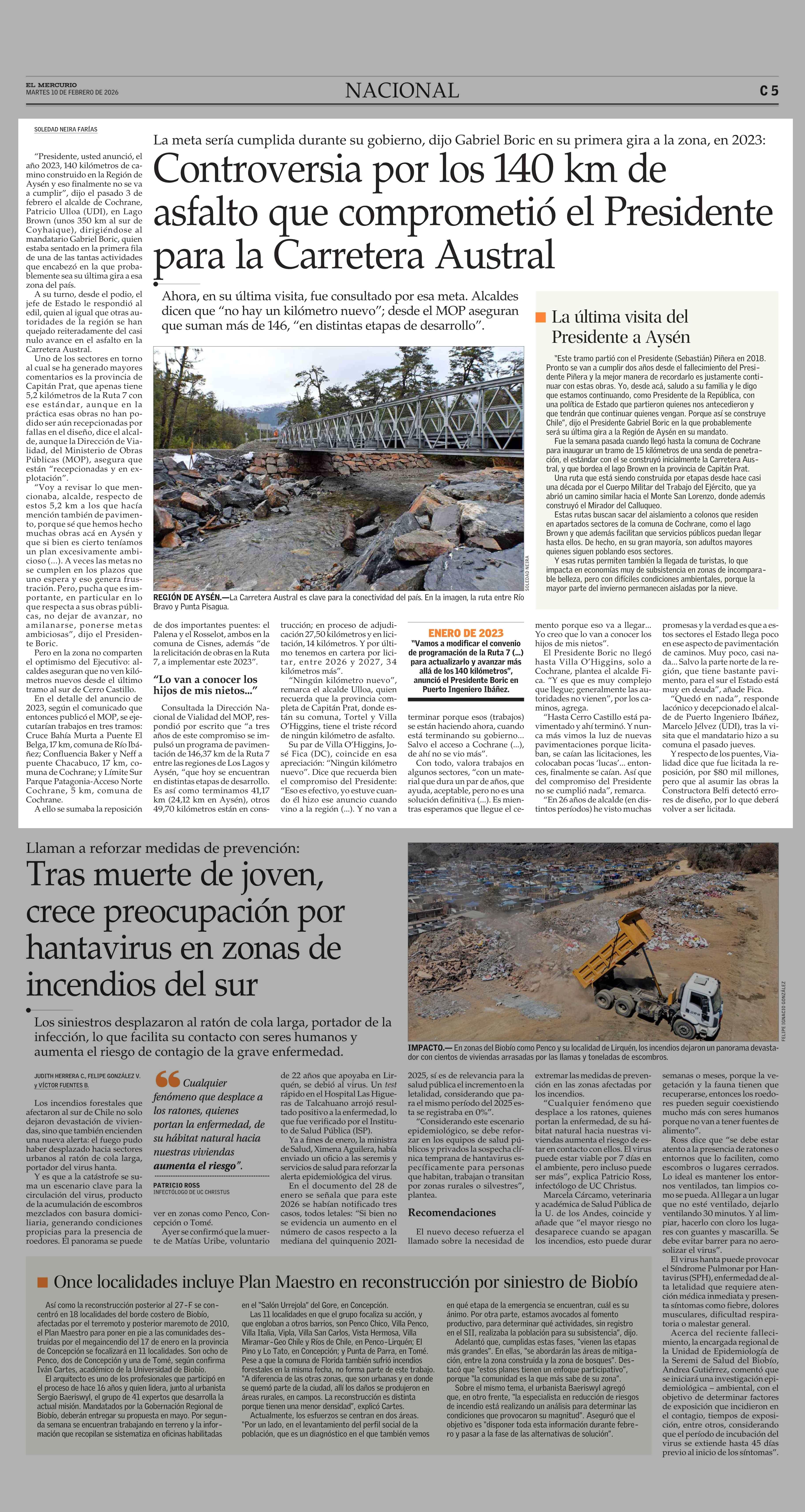 Controversia por los 140 km de asfalto que comprometió el Presidente para la Carretera Austral 10-02-2026 El Mercurio |