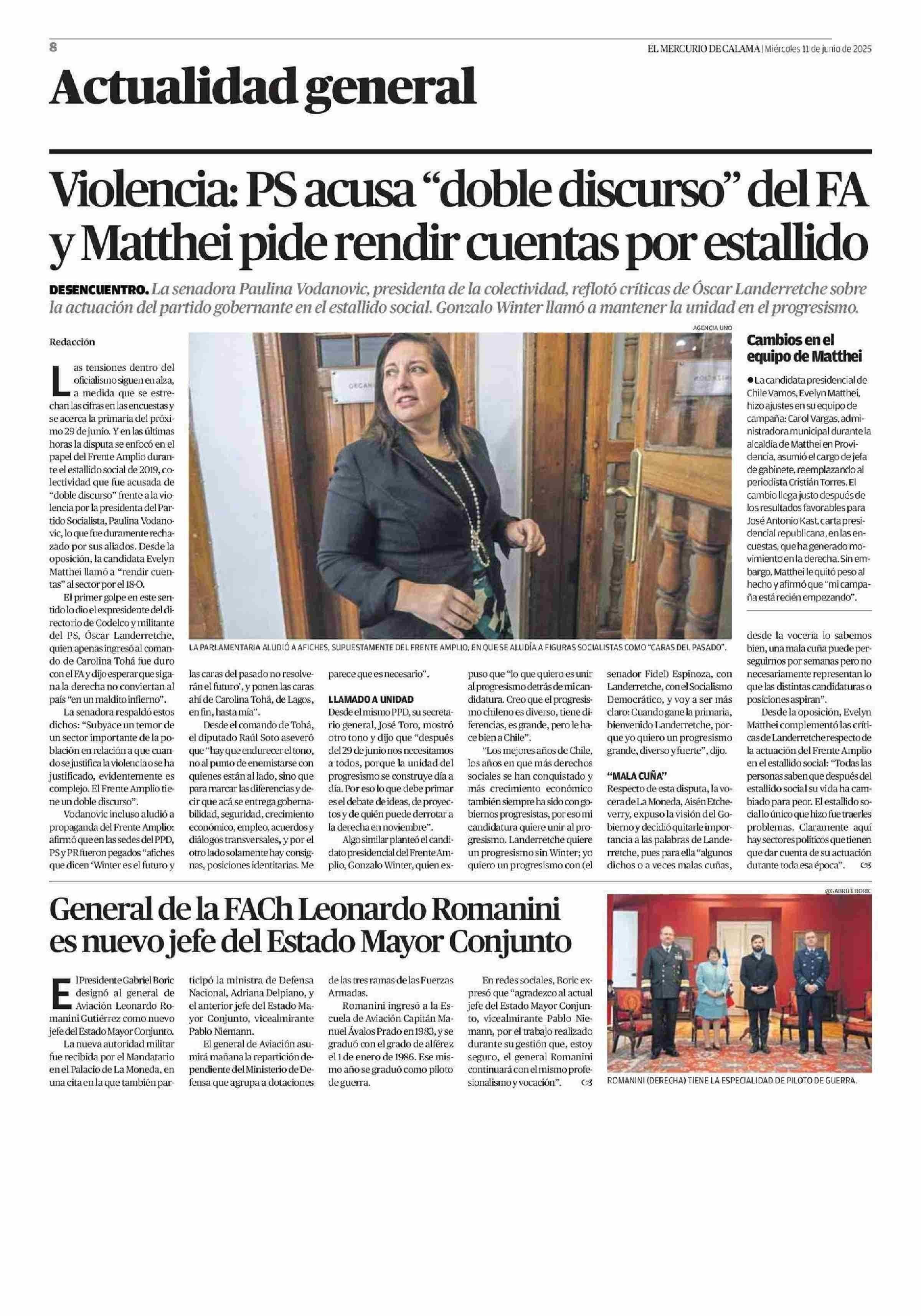 General de la FACh Leonardo Romanini es nuevo jefe del Estado Mayor Conjunto 11-06-2025 El Mercurio de Calama |
