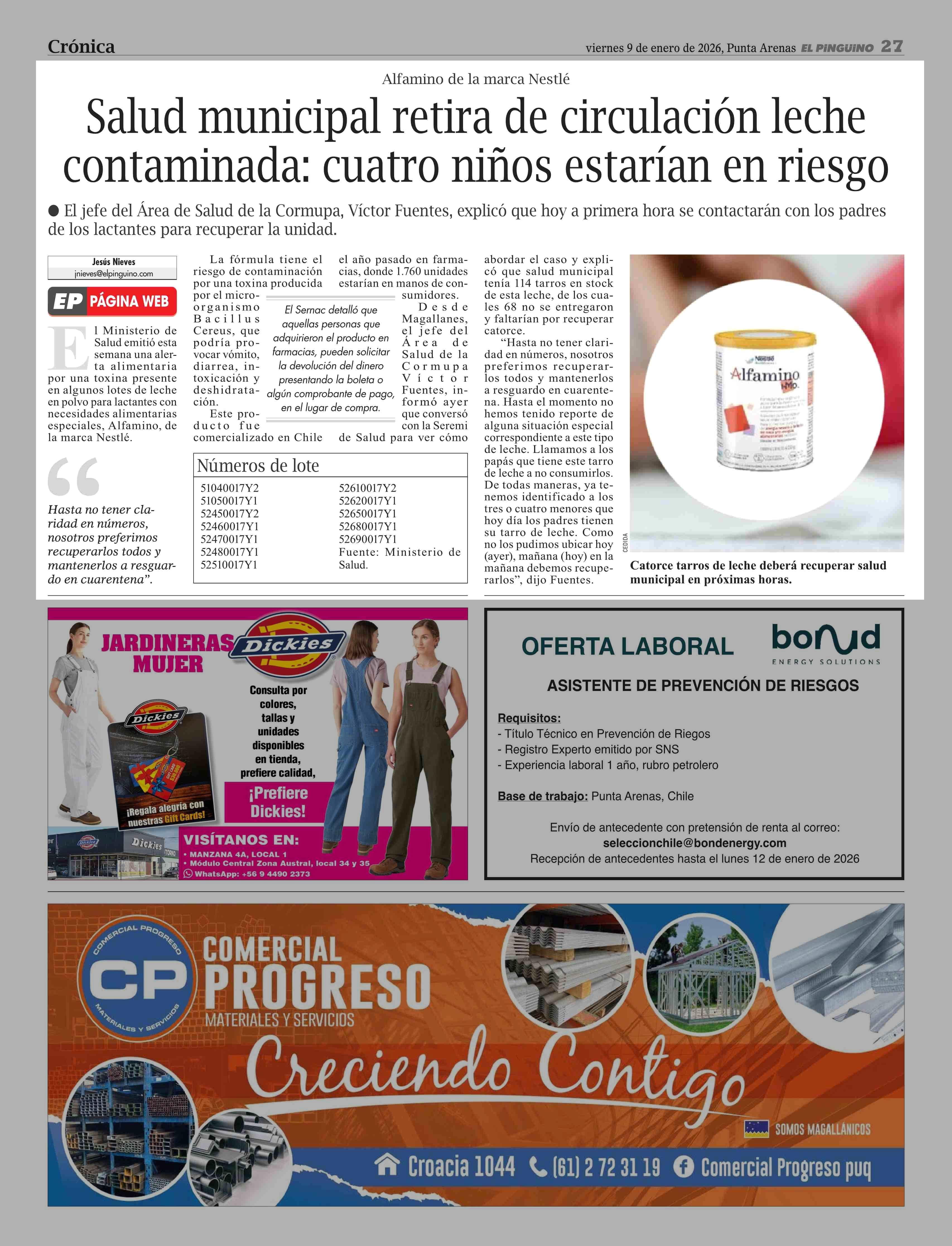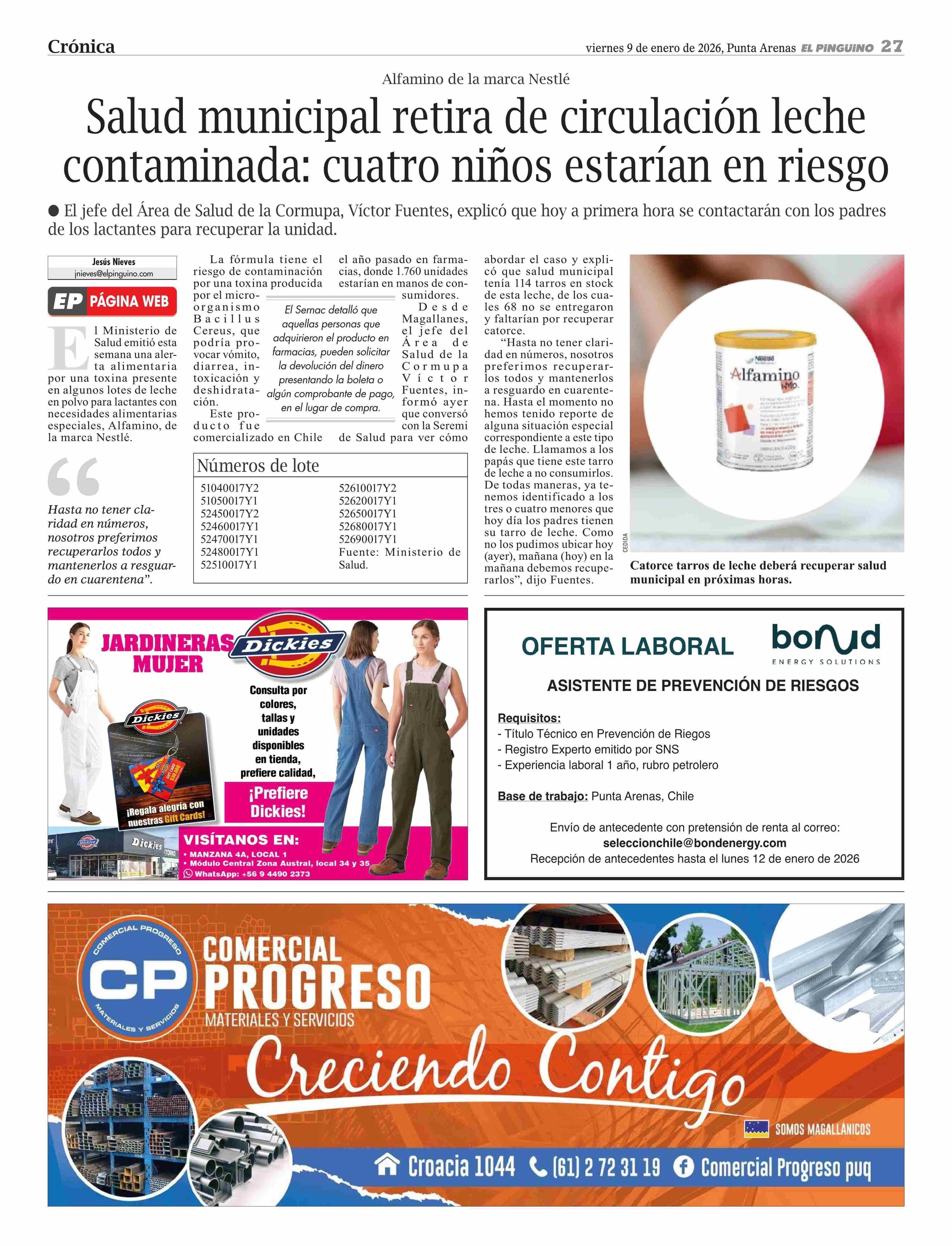 Salud municipal retira de circulación leche contaminada: cuatro niños estarían en riesgo 09-01-2026 El Pingüino |