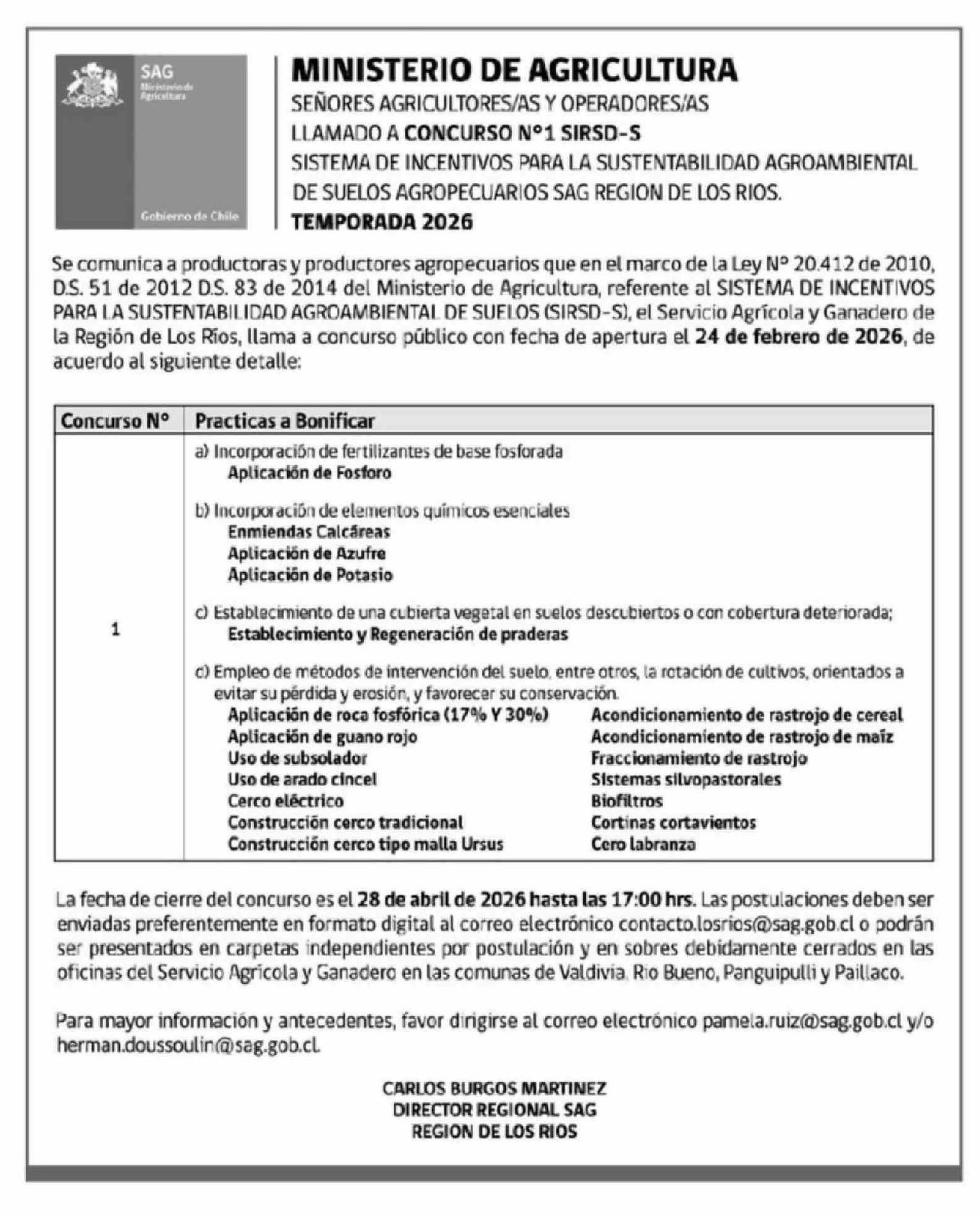 Aviso Licitaciones: MINISTERIO DE AGRICULTURA 17-02-2026 Diario Austral Región de Los Ríos |