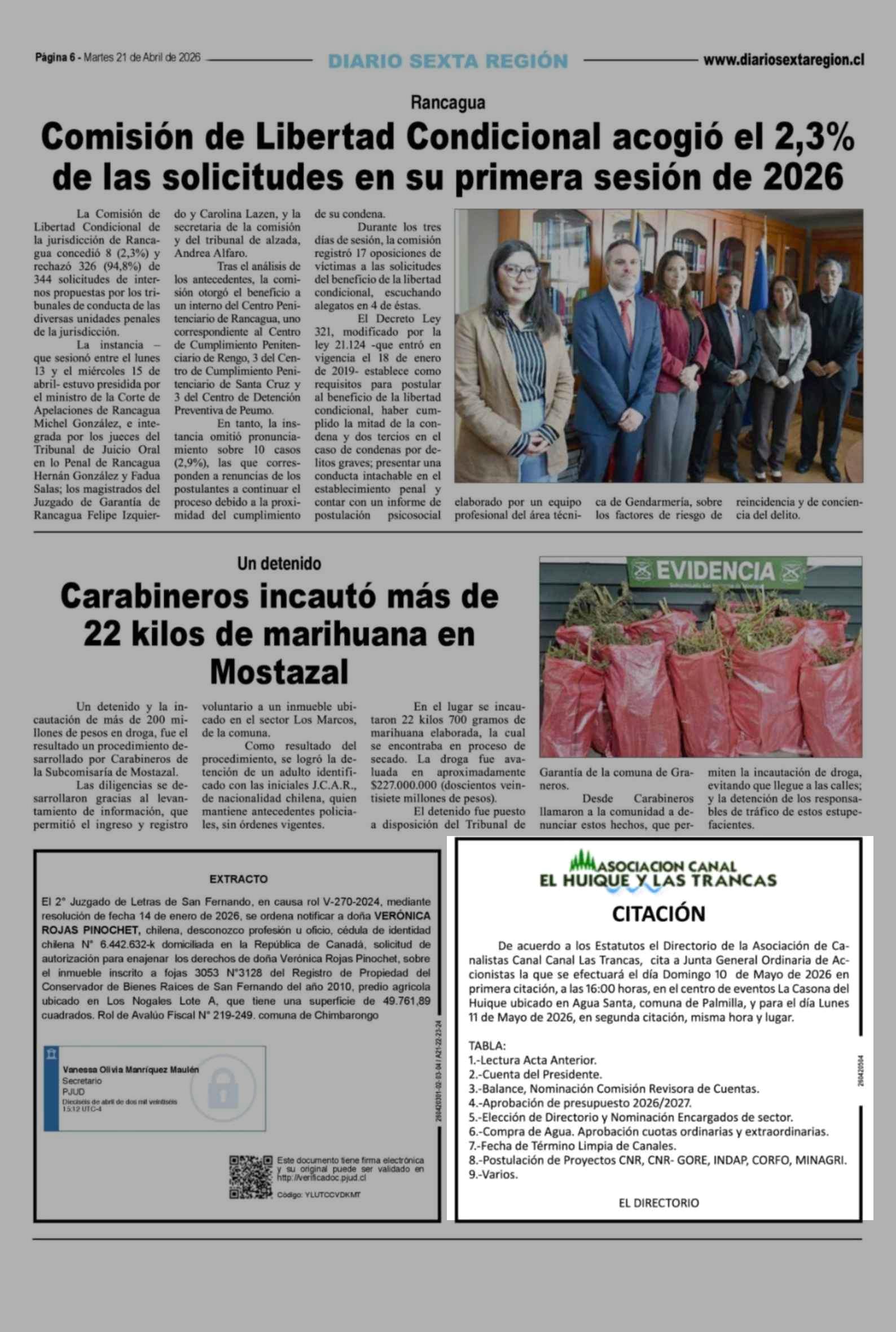 ASOCIACION CANAL EL HUIQUE Y LAS TRANCAS 21-04-2026 Diario VI Región |