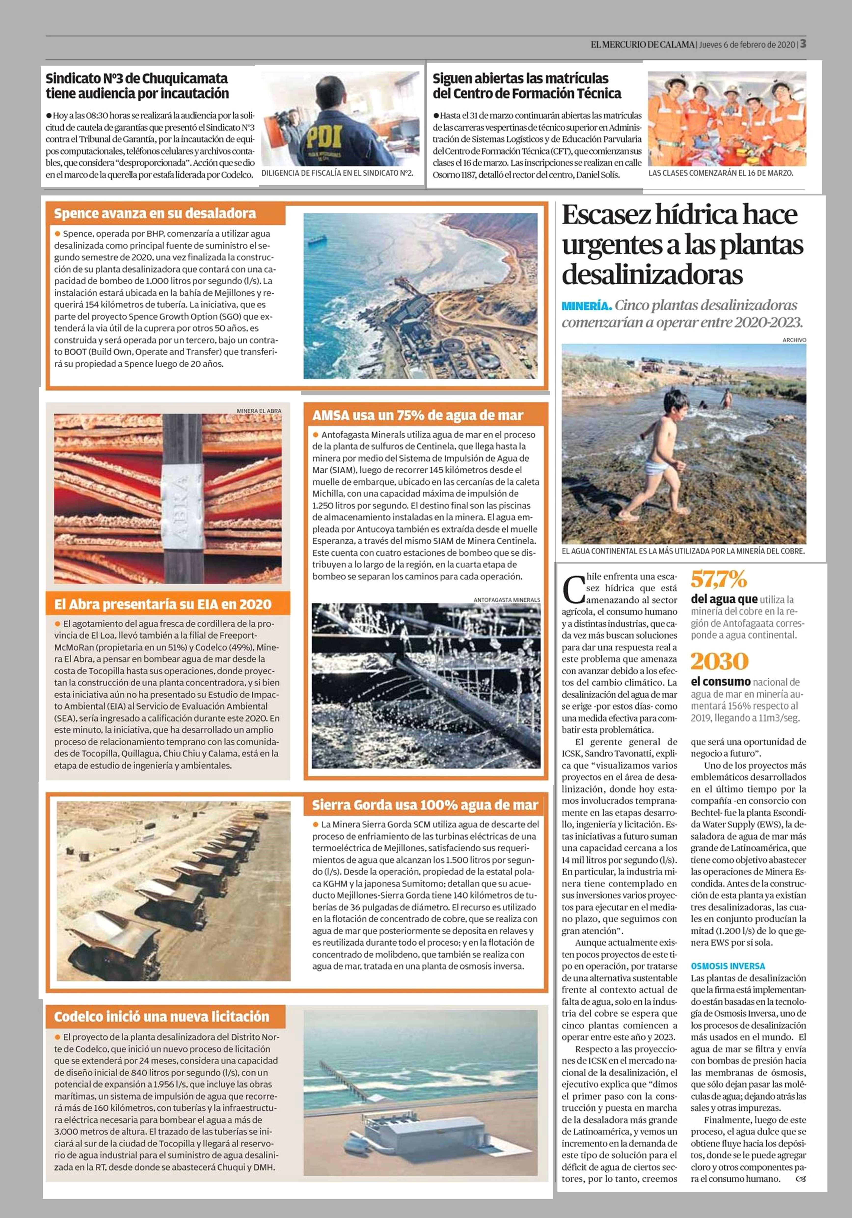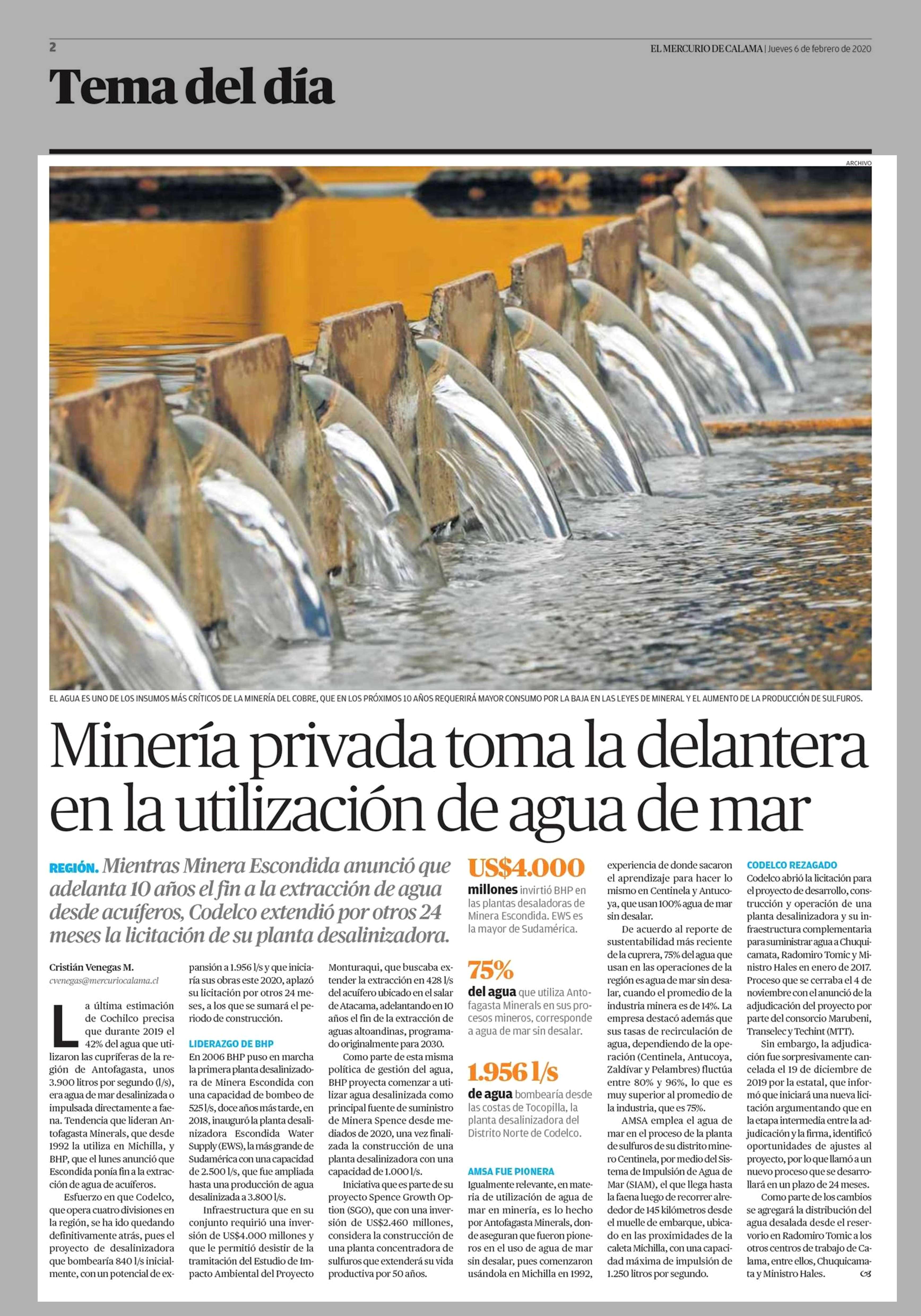 Minería privada toma la delantera en la utilización de agua de mar 06-02-2020 El Mercurio de Calama |