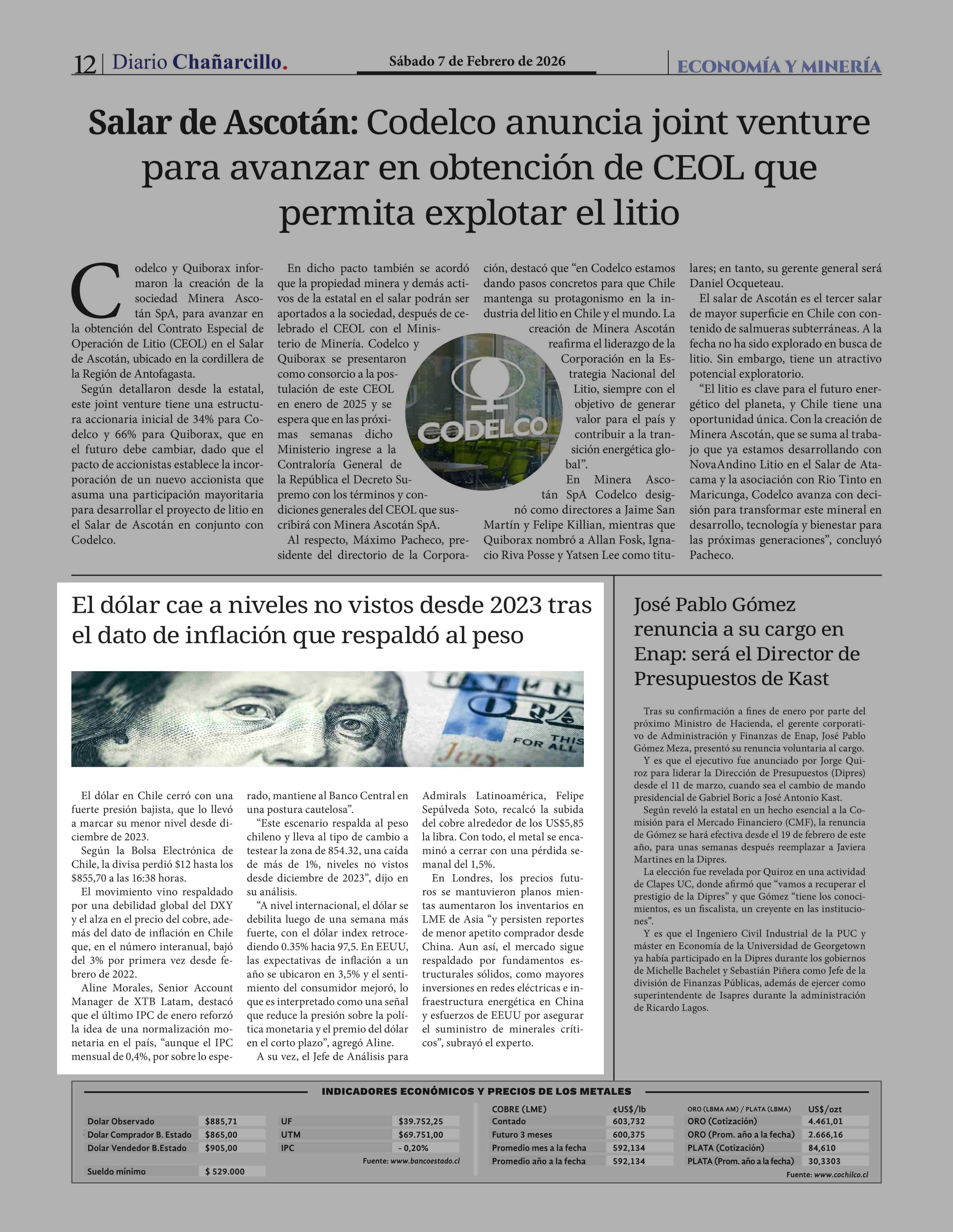 El dólar cae a niveles no vistos desde 2023 tras el dato de inflación que respaldó al peso 07-02-2026 Diario Chañarcillo |