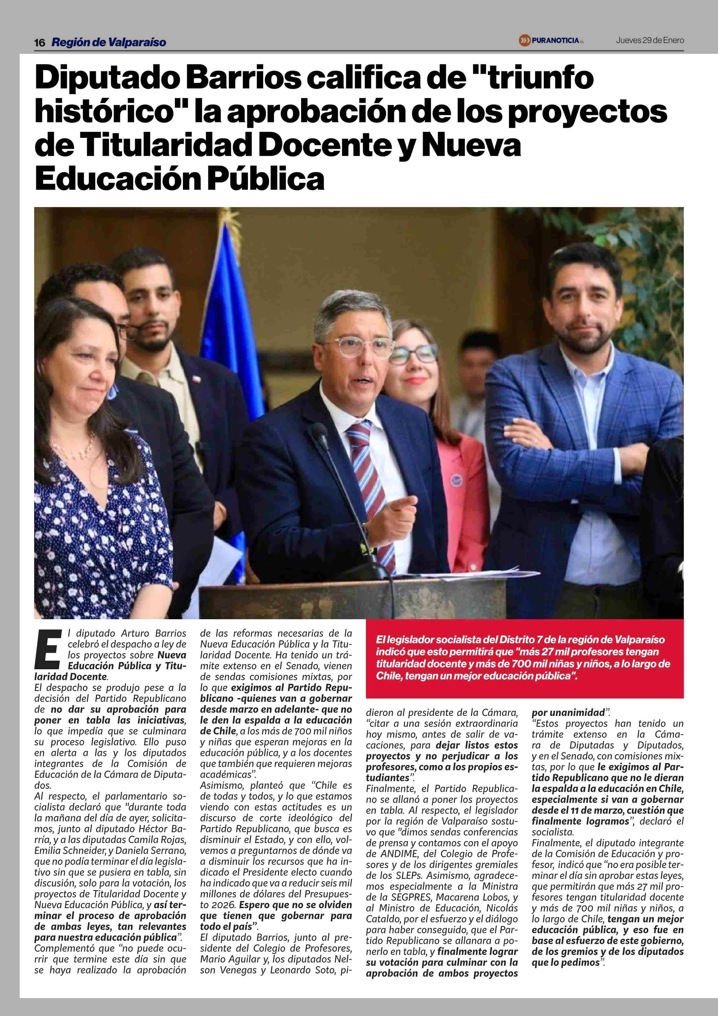 Diputado Barrios califica de "triunfo histórico” la aprobación de los proyectos de Titularidad Docente y Nueva Educación Pública 29-01-2026 Puranoticia.cl |