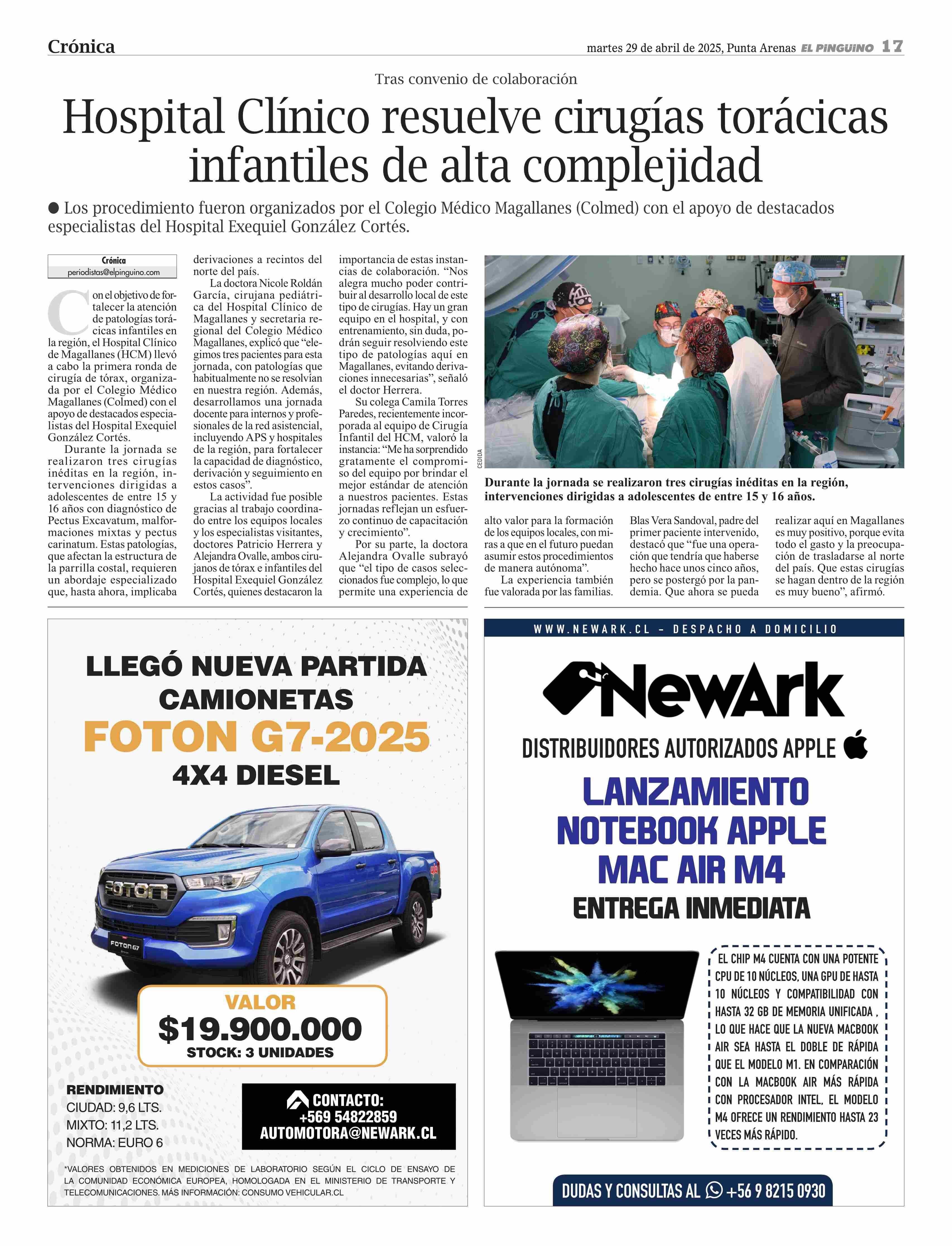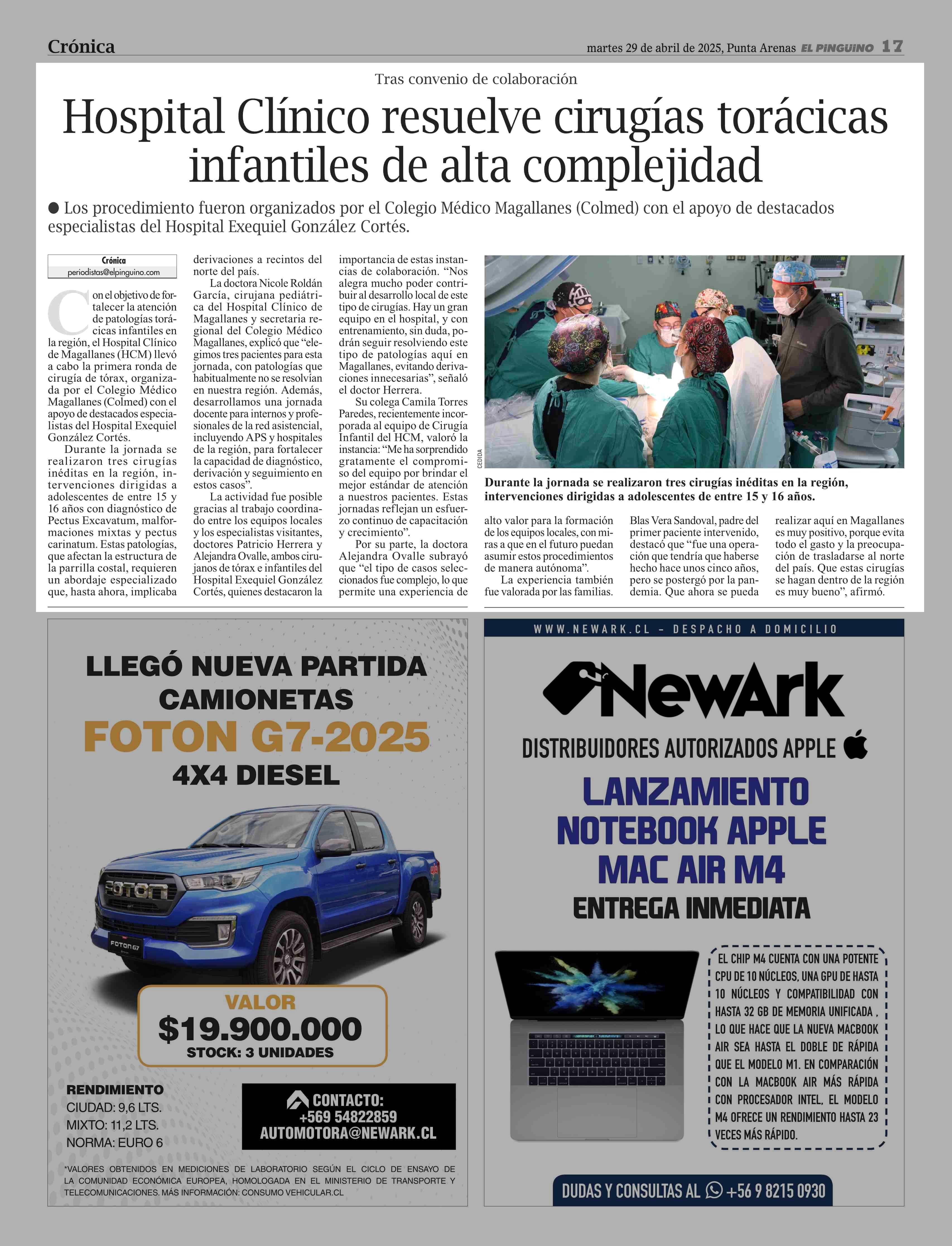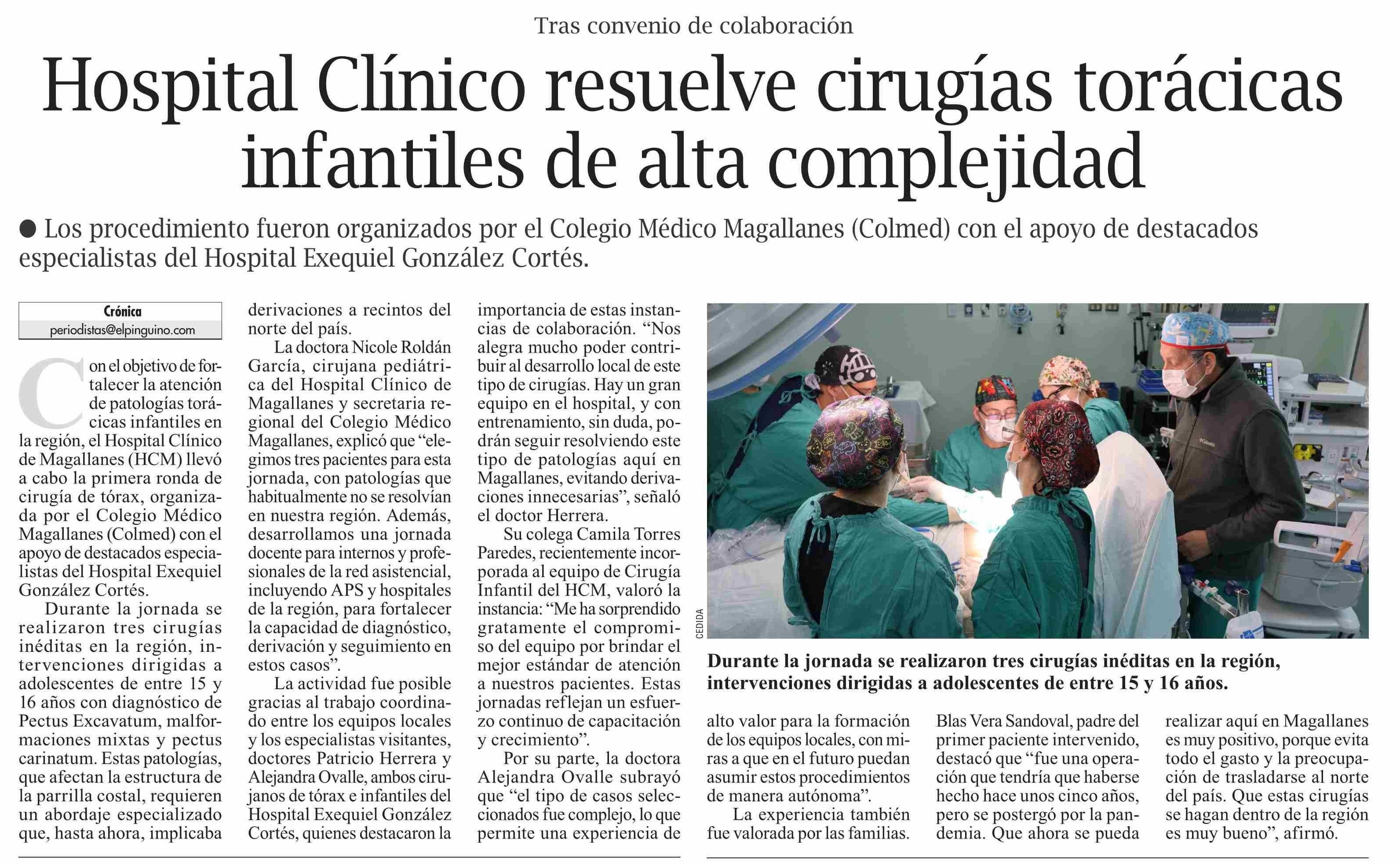 Hospital Clínico resuelve cirugías torácicas infantiles de alta complejidad 29-04-2025 El Pingüino |