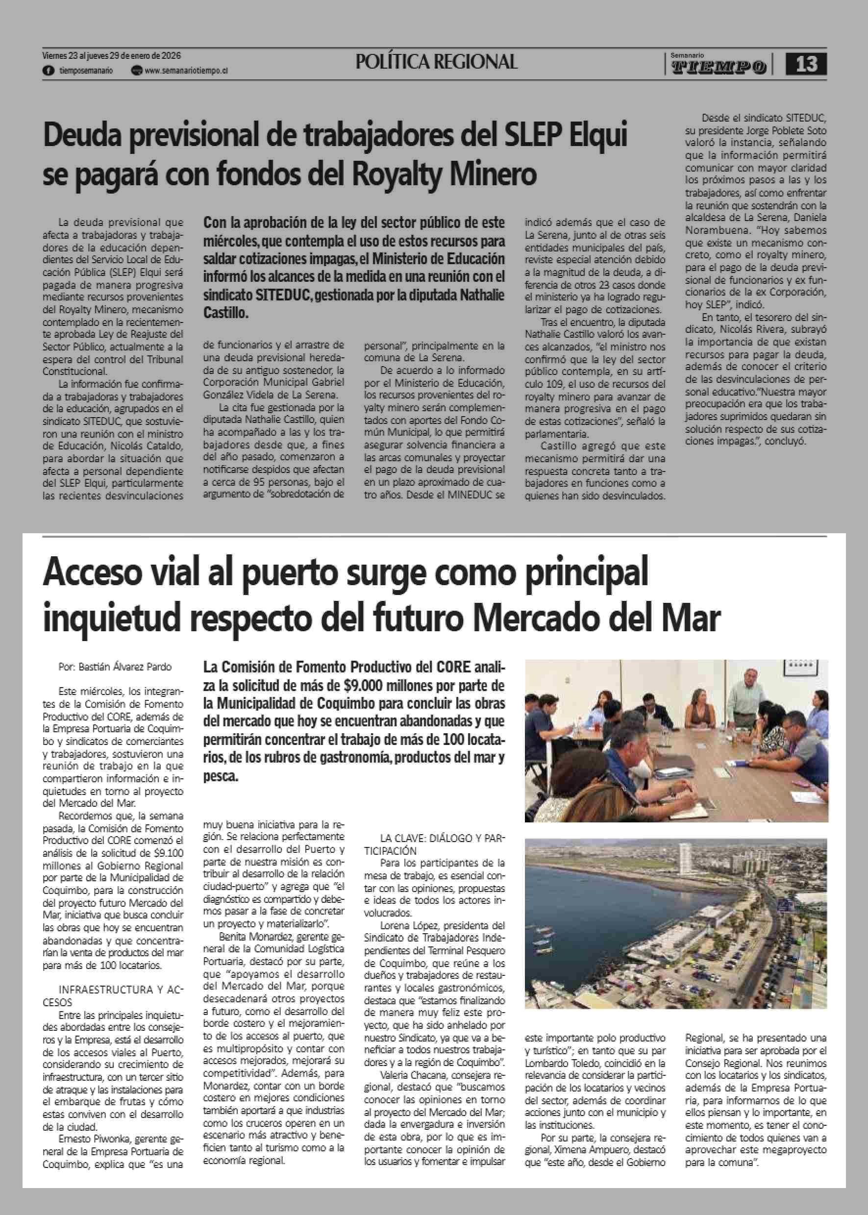 Acceso vial al puerto surge como principal inquietud respecto del futuro Mercado del Mar 23-01-2026 Semanario Tiempo |