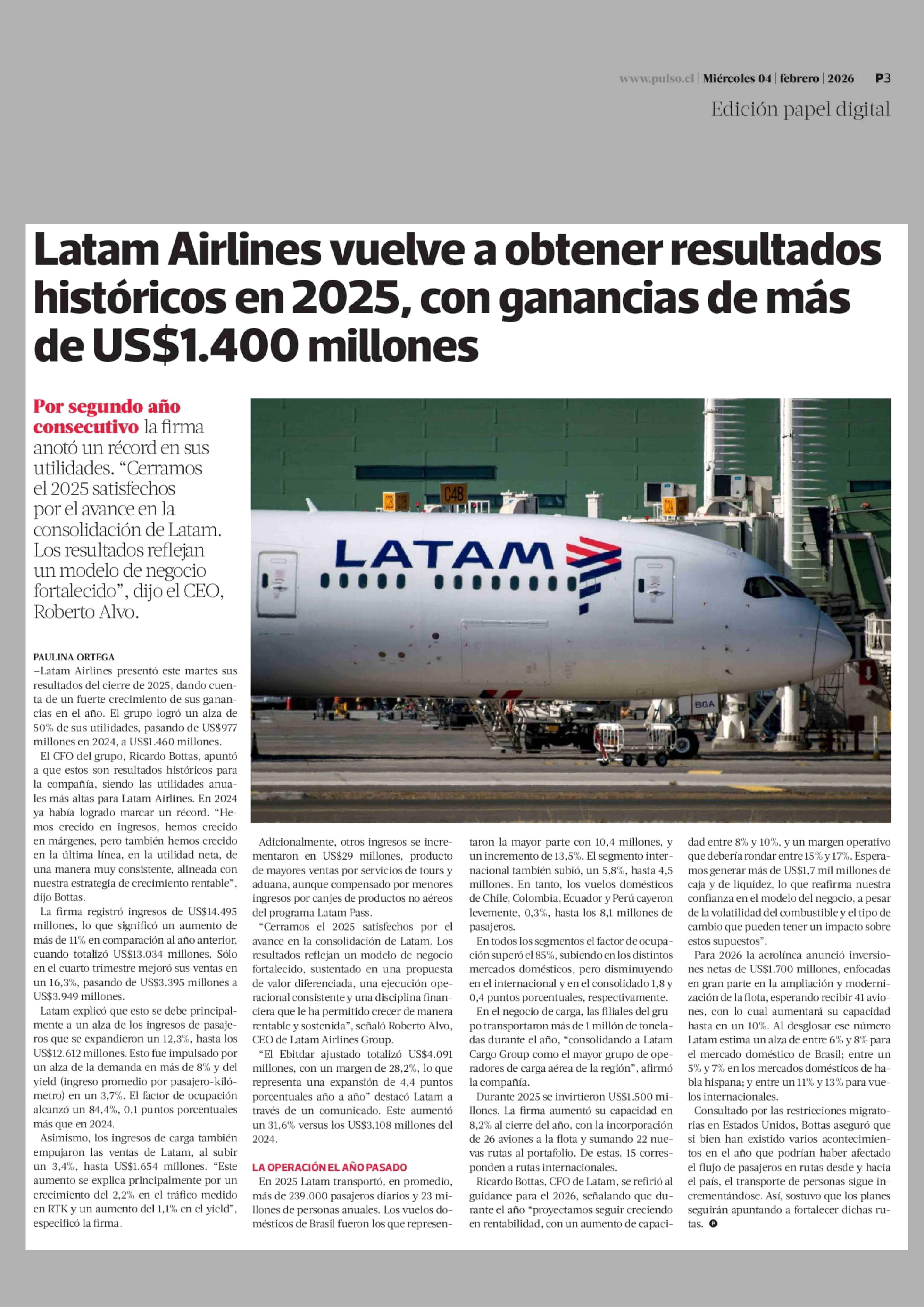 Latam Airlines vuelve a obtener resultados históricos en 2025, con ganancias de más de US$1.400 millones 04-02-2026 La Tercera |