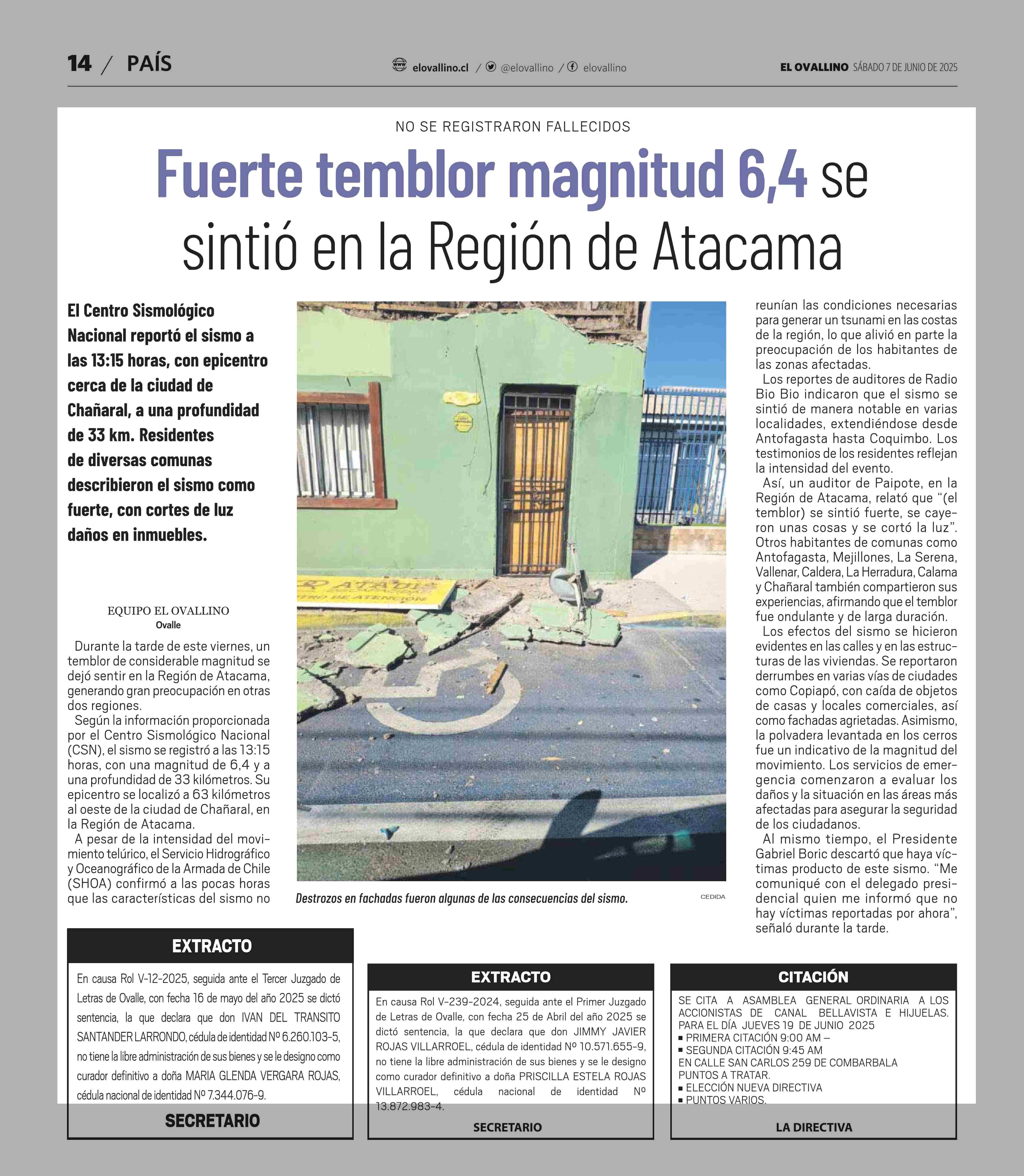 Fuerte temblor magnitud 6,4 se sintió en la Región de Atacama 07-06-2025 El Ovallino |