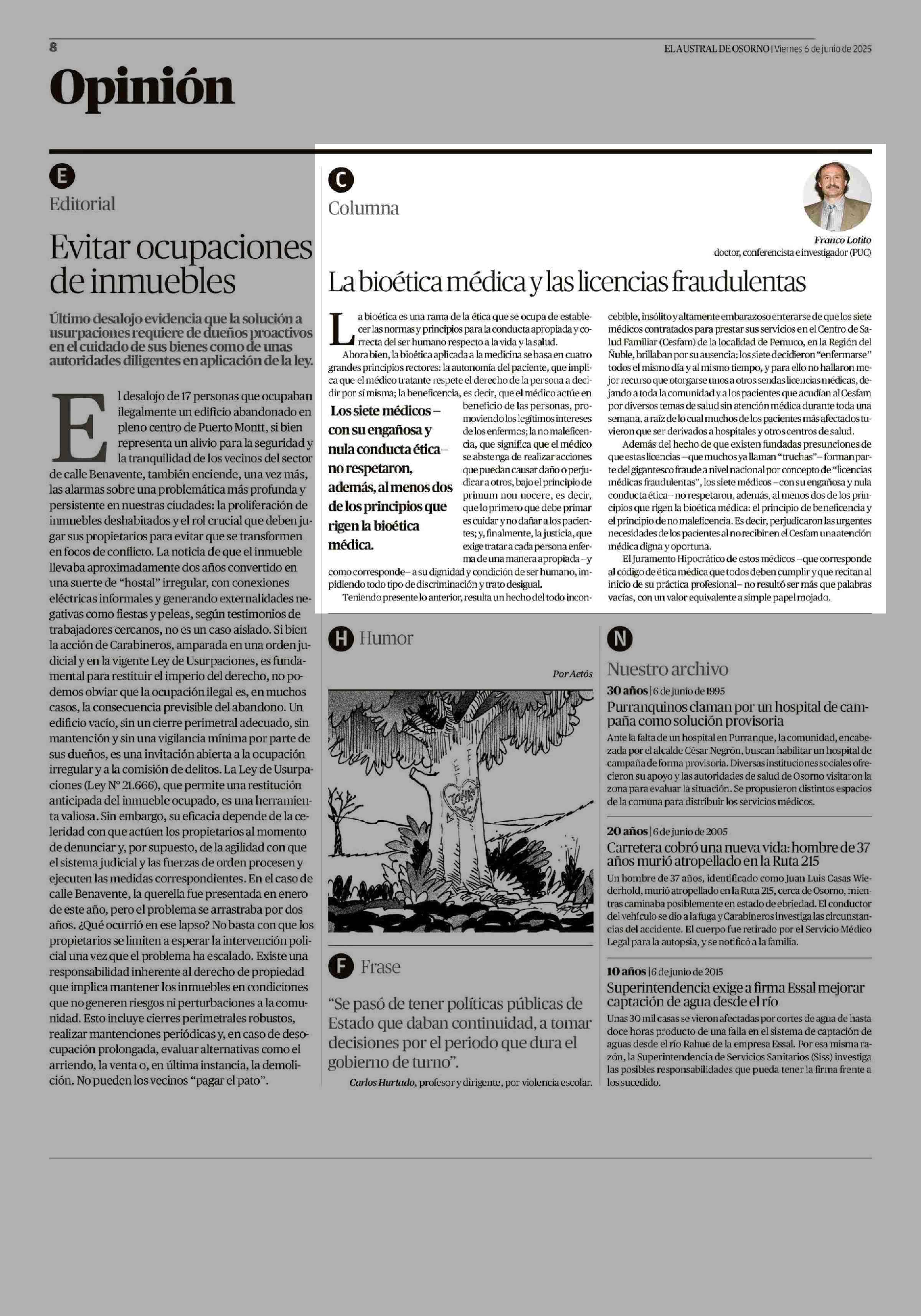 Columnas de Opinión: La bioética médica y las licencias fraudulentas 06-06-2025 El Austral de Osorno |