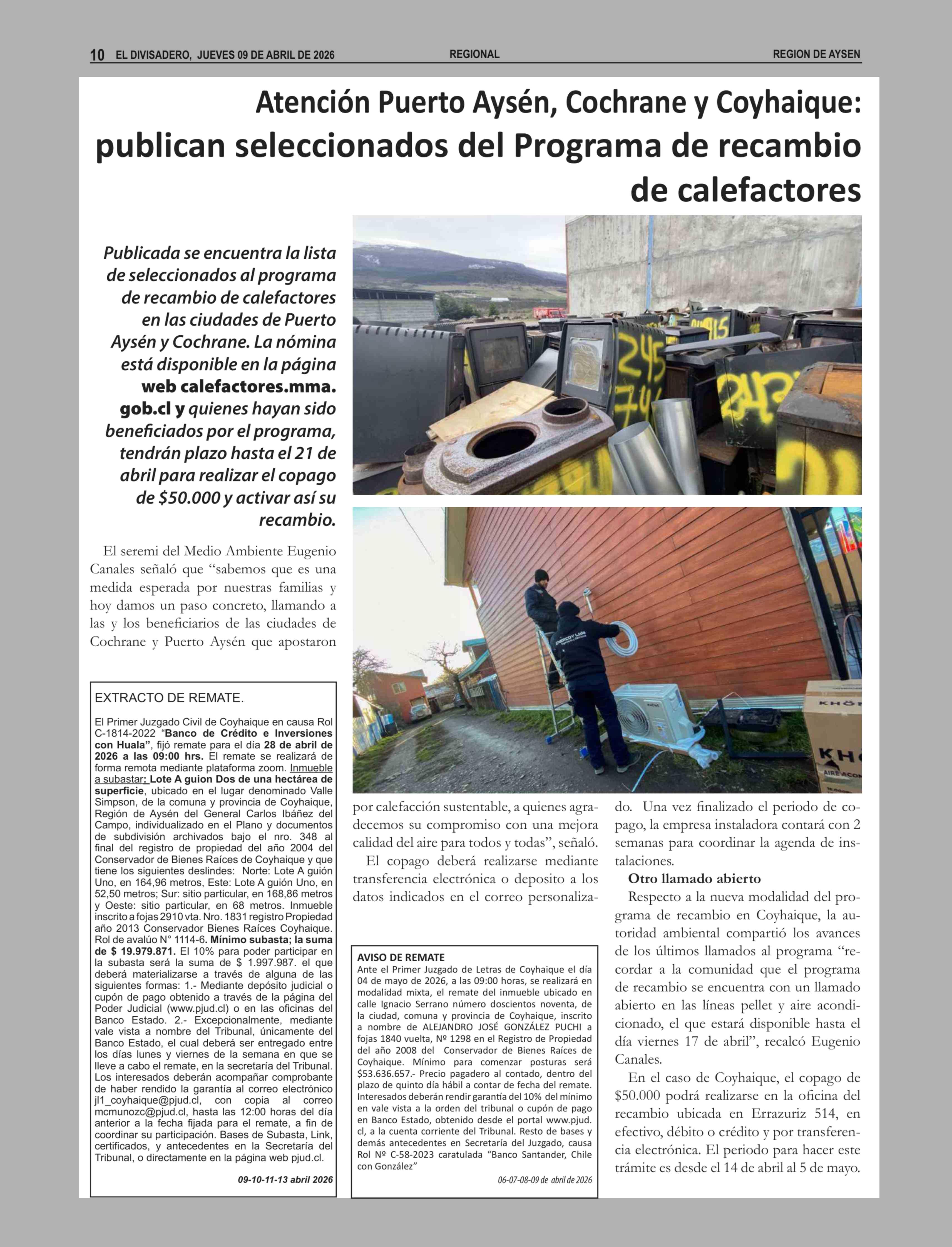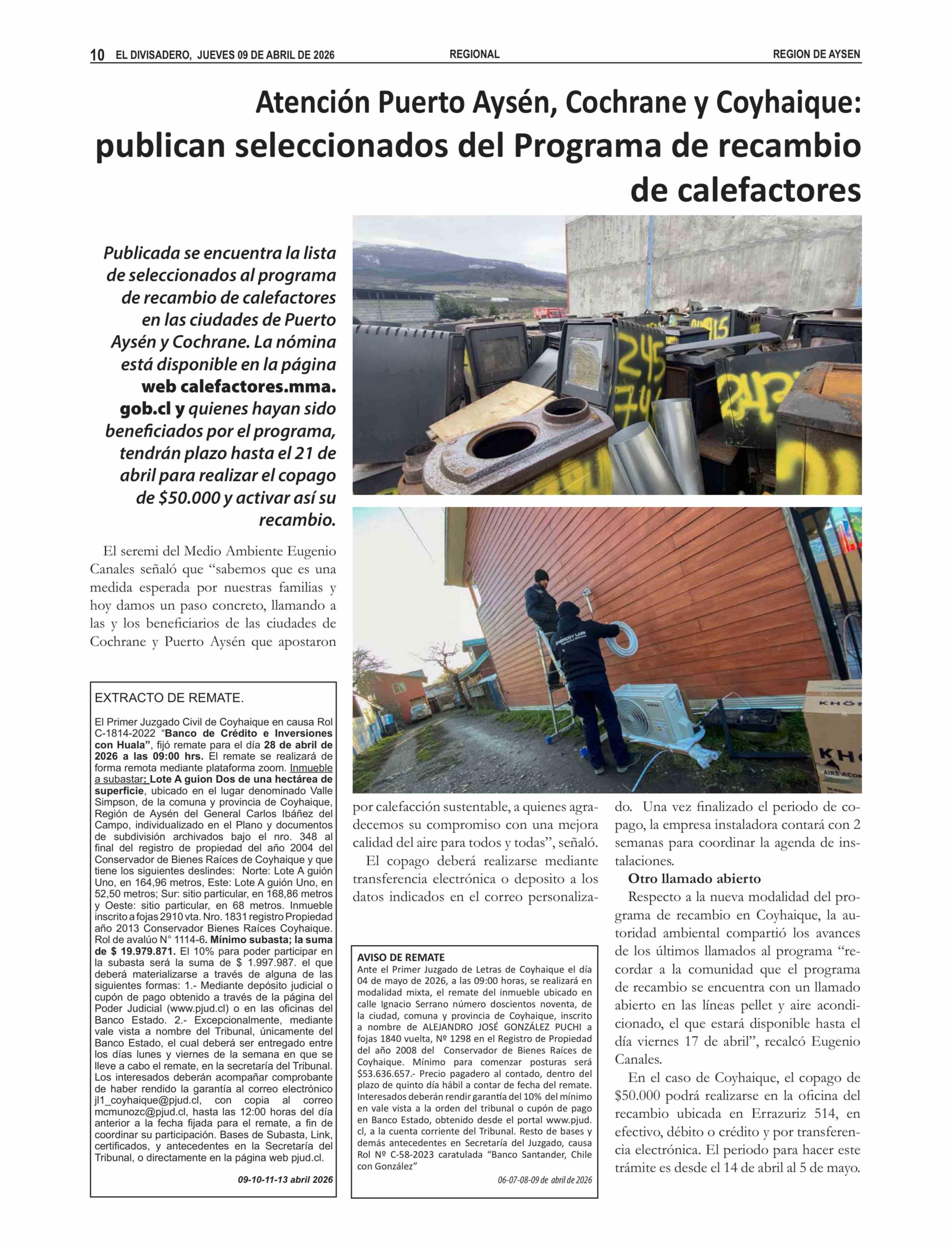 Atención Puerto Aysén, Cochrane y Coyhaique: publican seleccionados del Programa de recambio de calefactores 09-04-2026 El Divisadero |