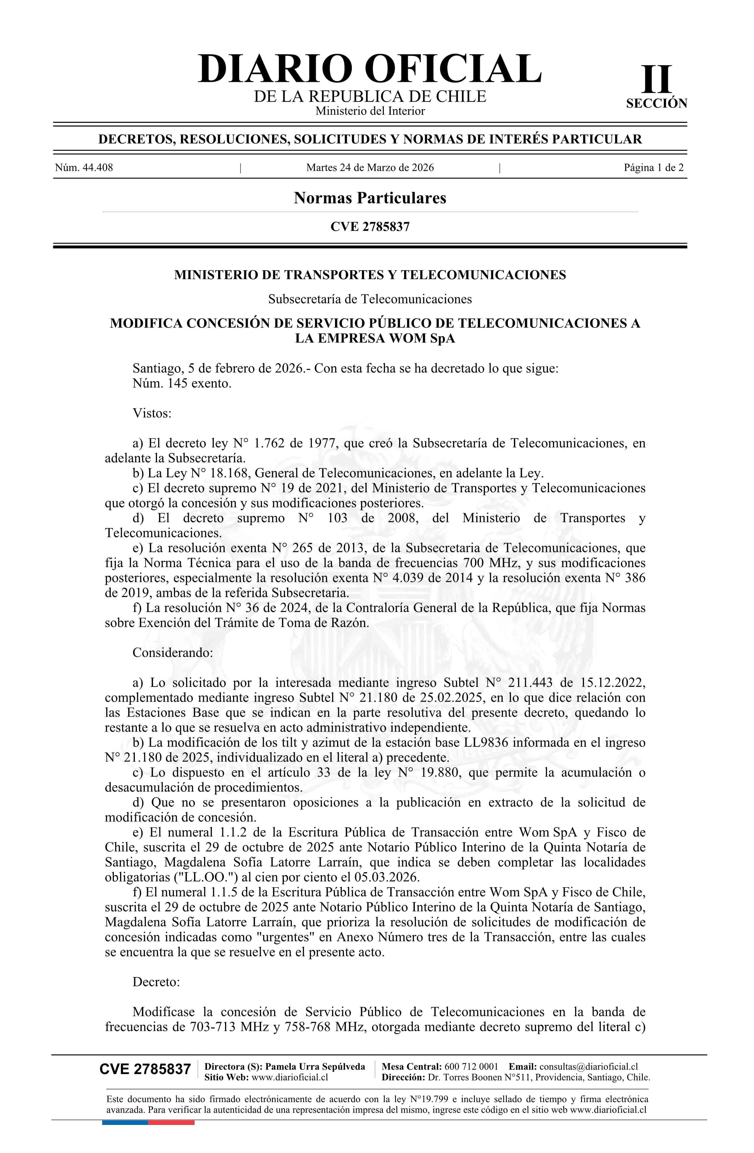 Decreto exento número 145, de 2026.- Modifica concesión de servicio público de telecomunicaciones a la empresa Wom SpA 24-03-2026 Diario Oficial Edición Electrónica |