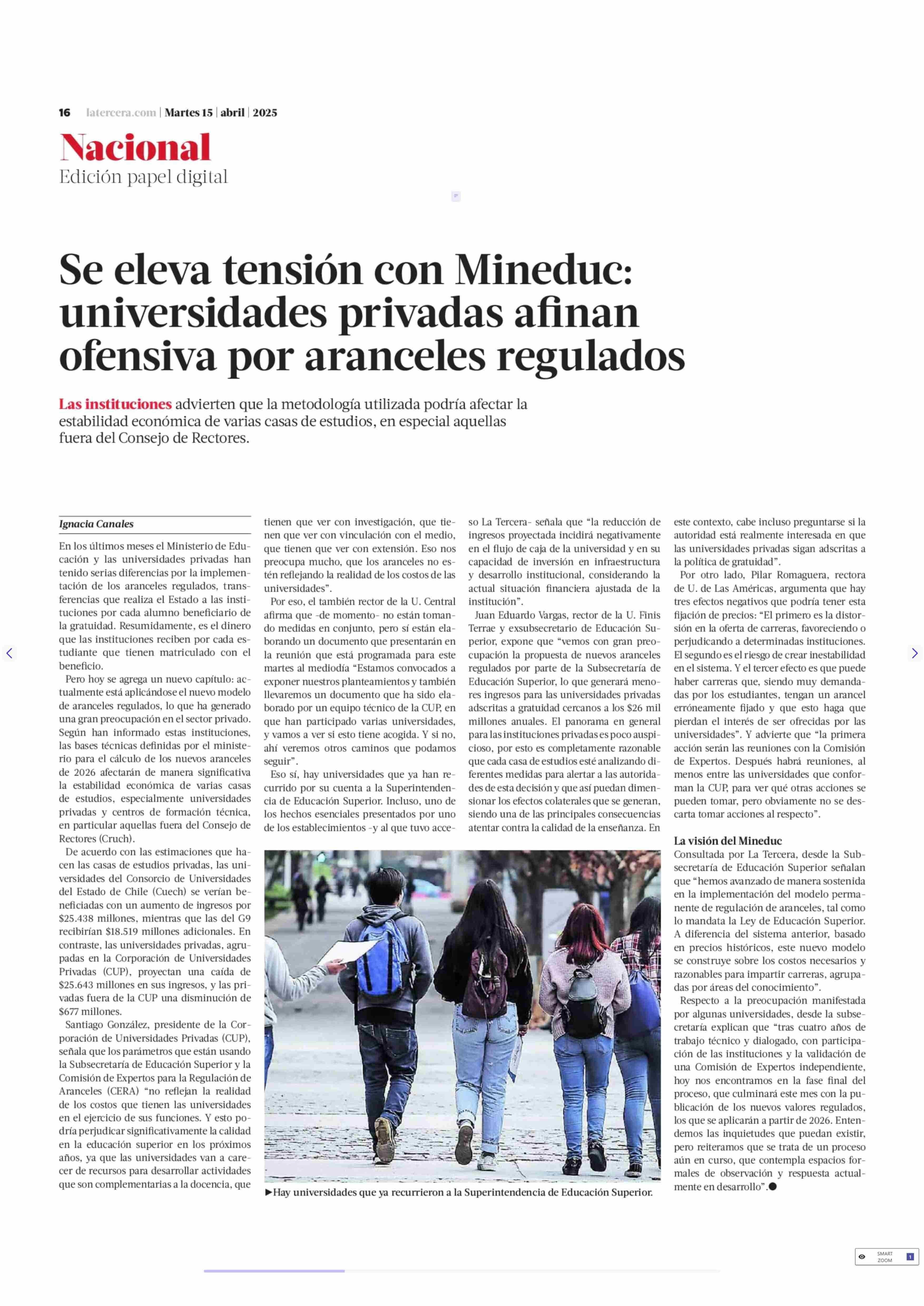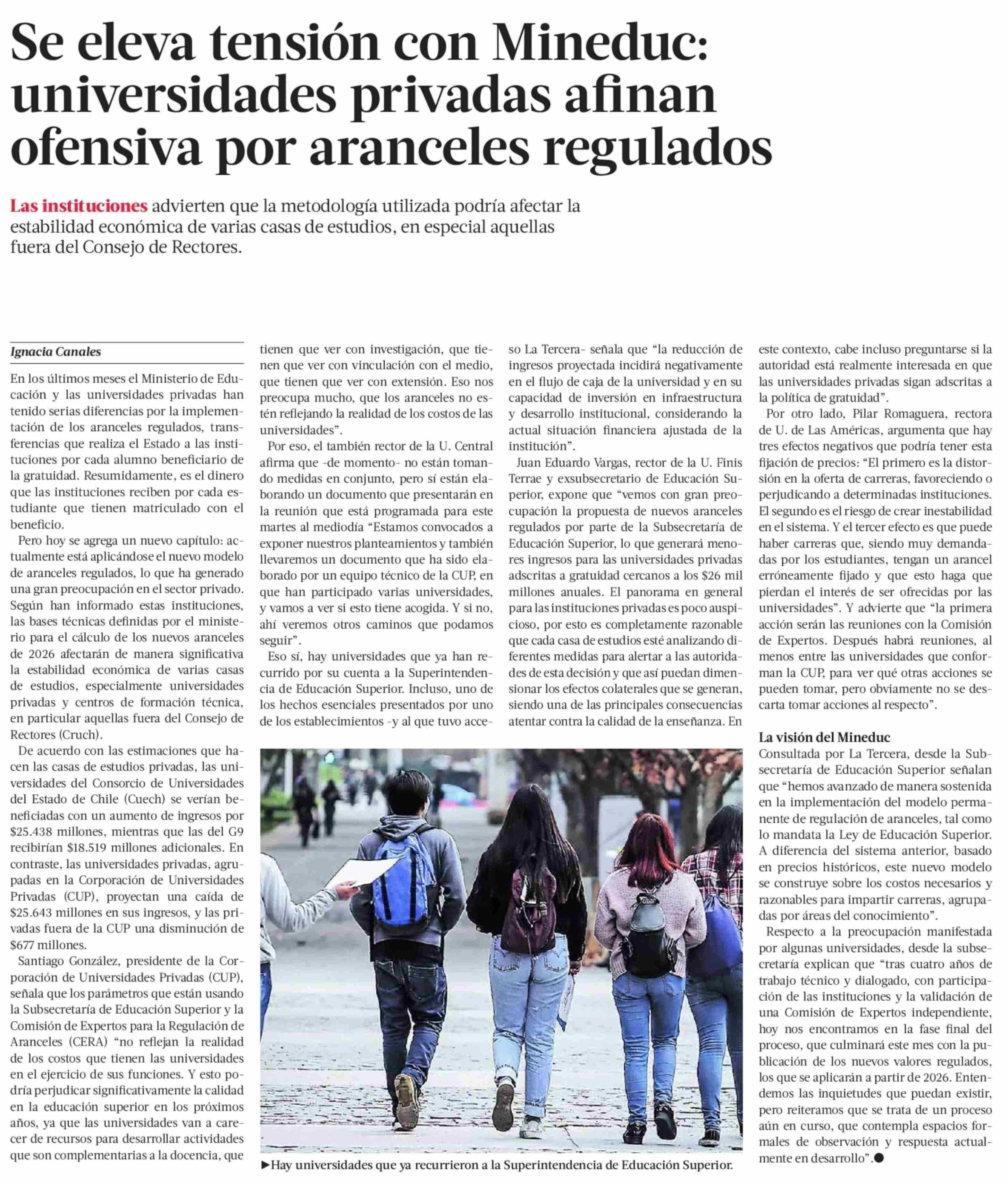 Se eleva tensión con Mineduc: universidades privadas afinan ofensiva por aranceles regulados 15-04-2025 La Tercera |