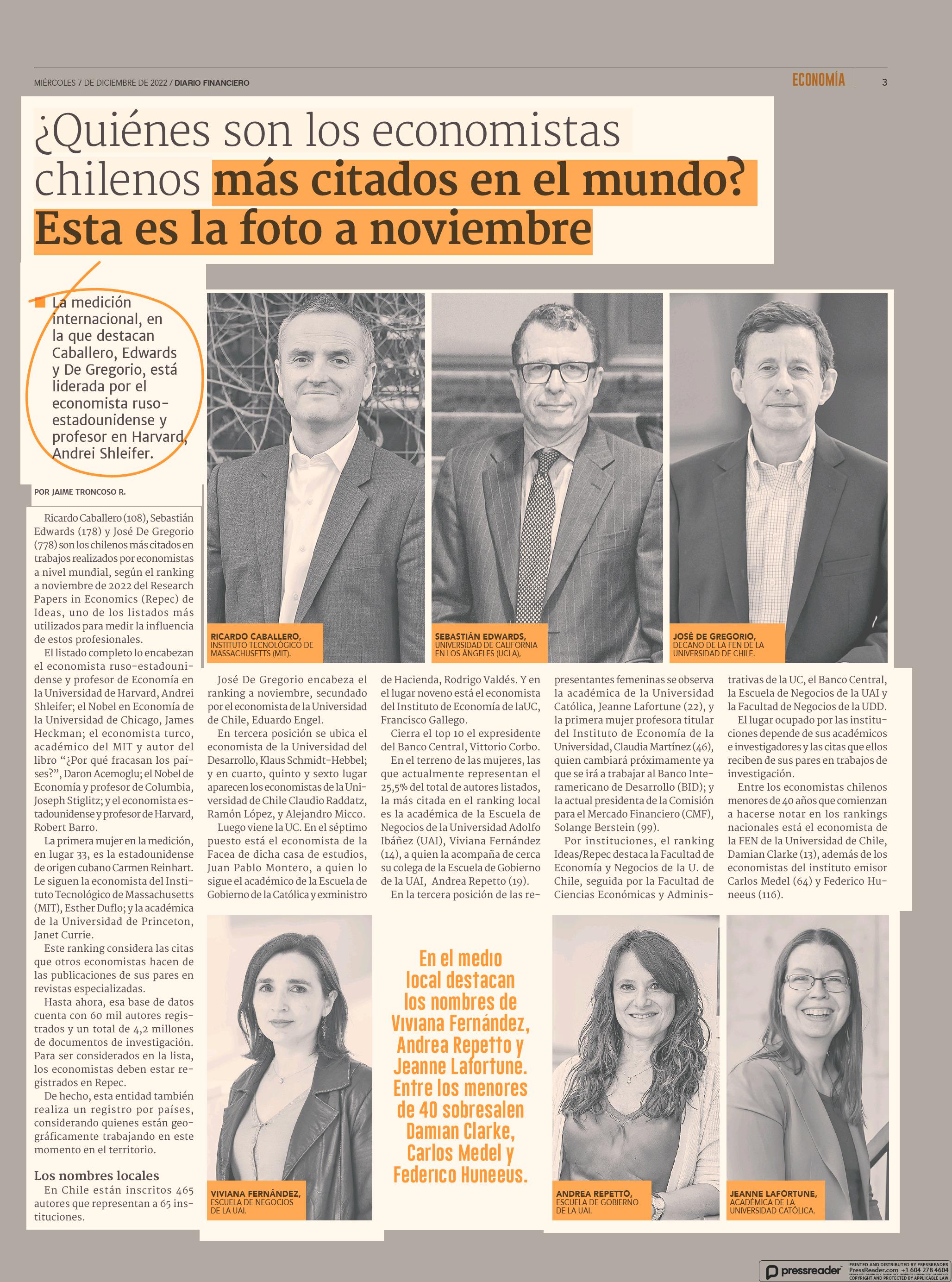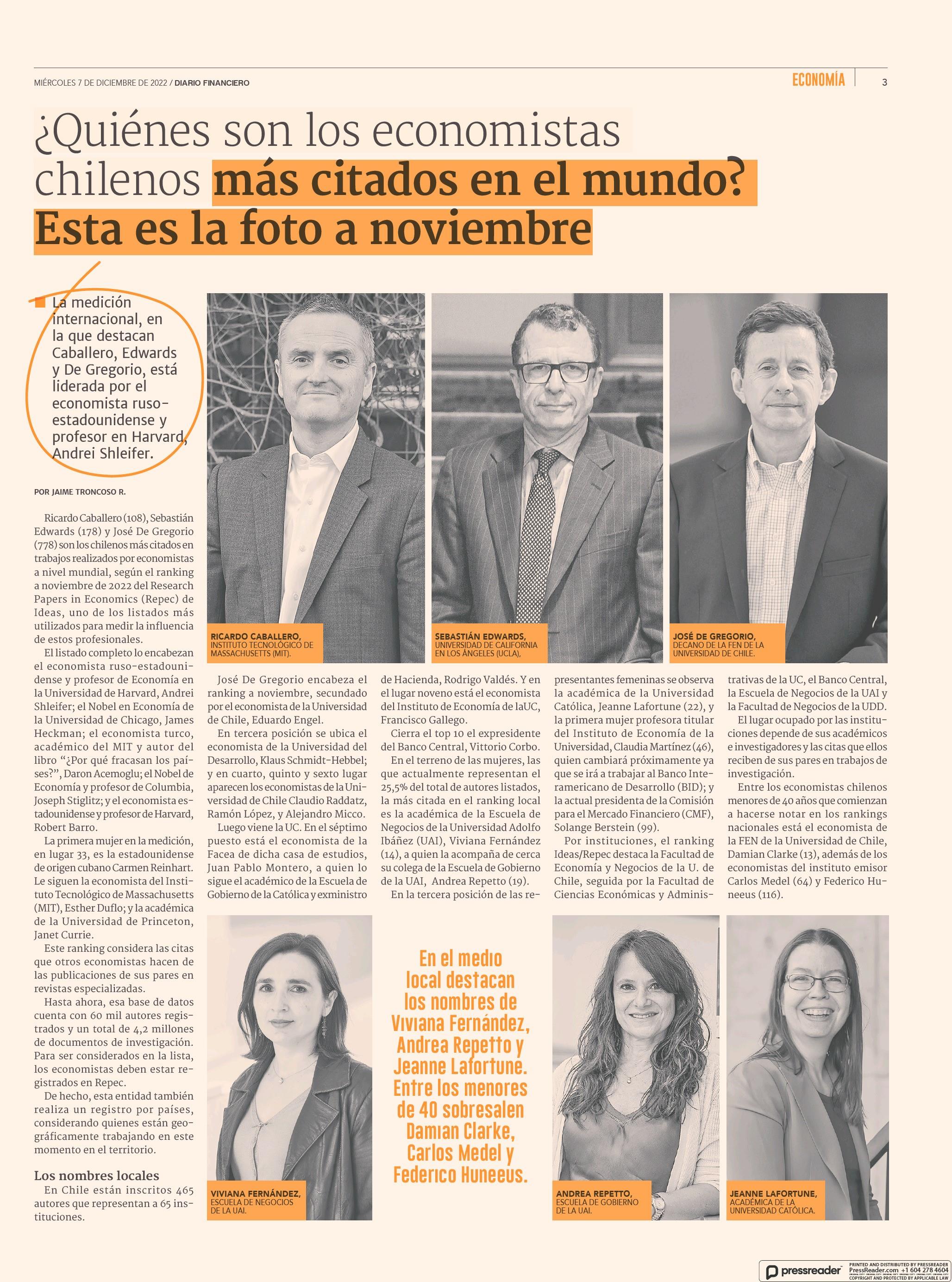 ¿ Quiénes son los economistas chilenos más citados en el mundo? Esta es la foto a noviembre 07-12-2022 Diario Financiero |