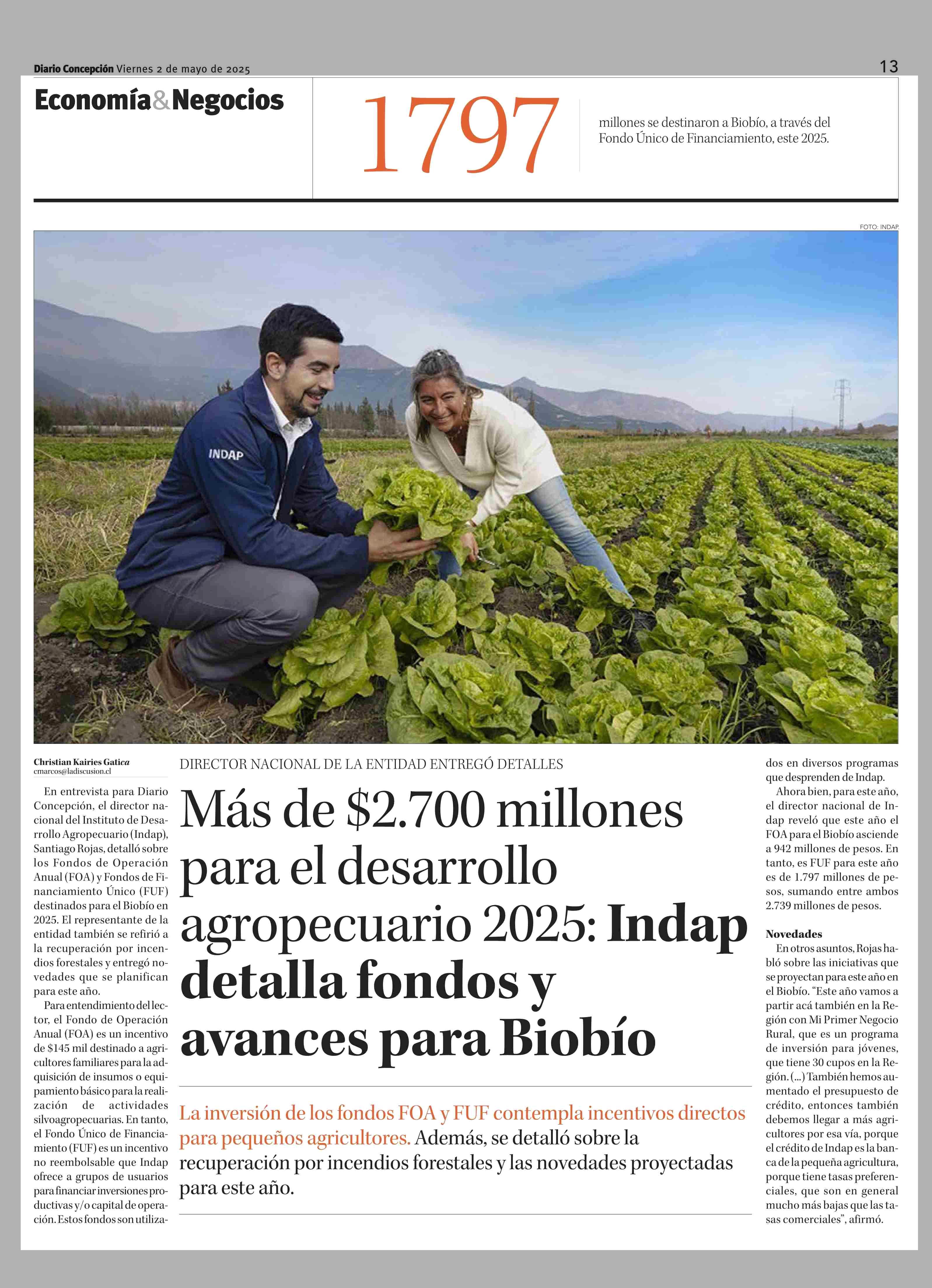 Más de $2.700 millones para el desarrollo agropecuario 2025: Indap detalla fondos y avances para Biobío 02-05-2025 Diario Concepción |