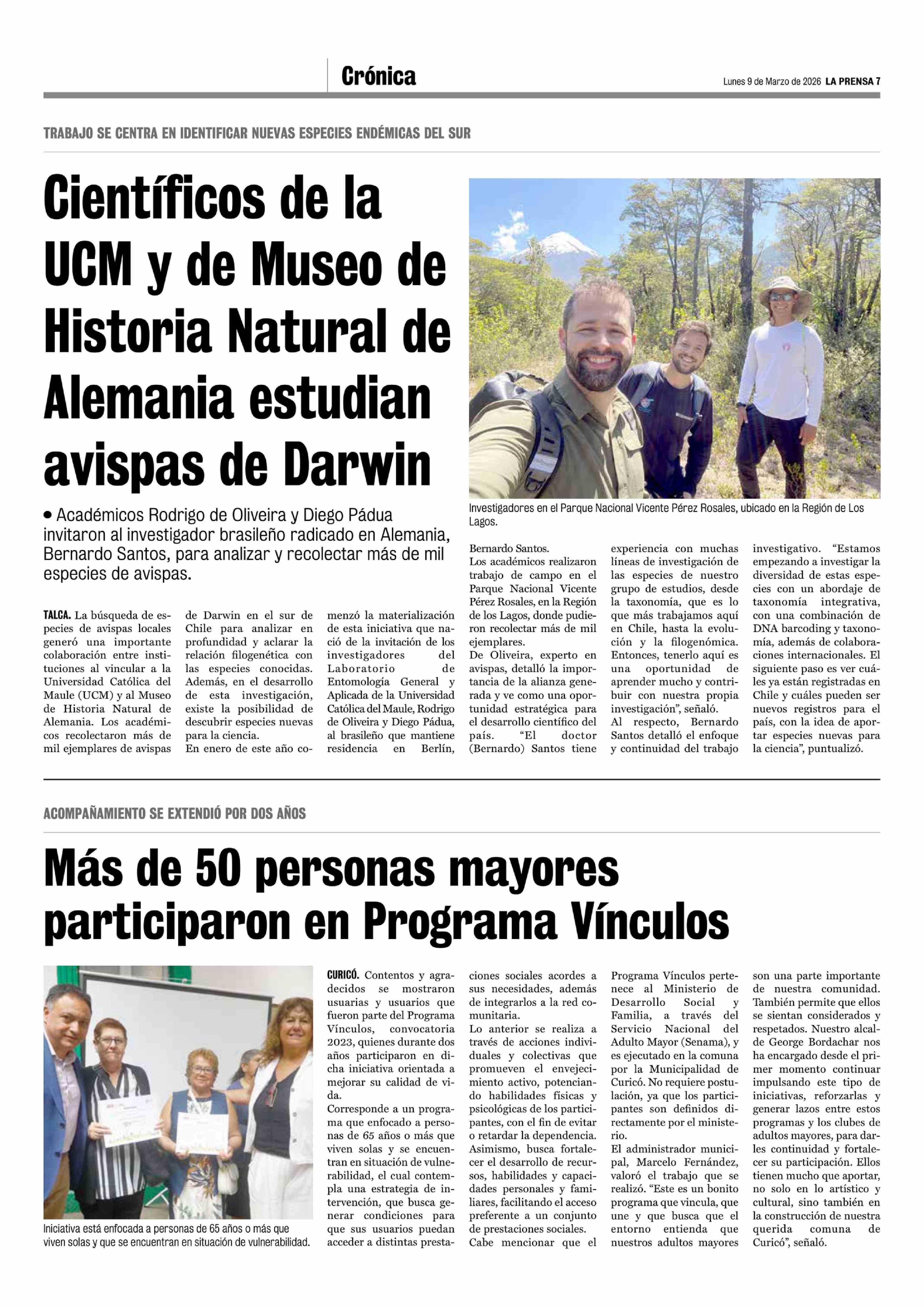 Científicos de la UCM y de Museo de Historia Natural de Alemania estudian avispas de Darwin 09-03-2026 La Prensa de Curicó |