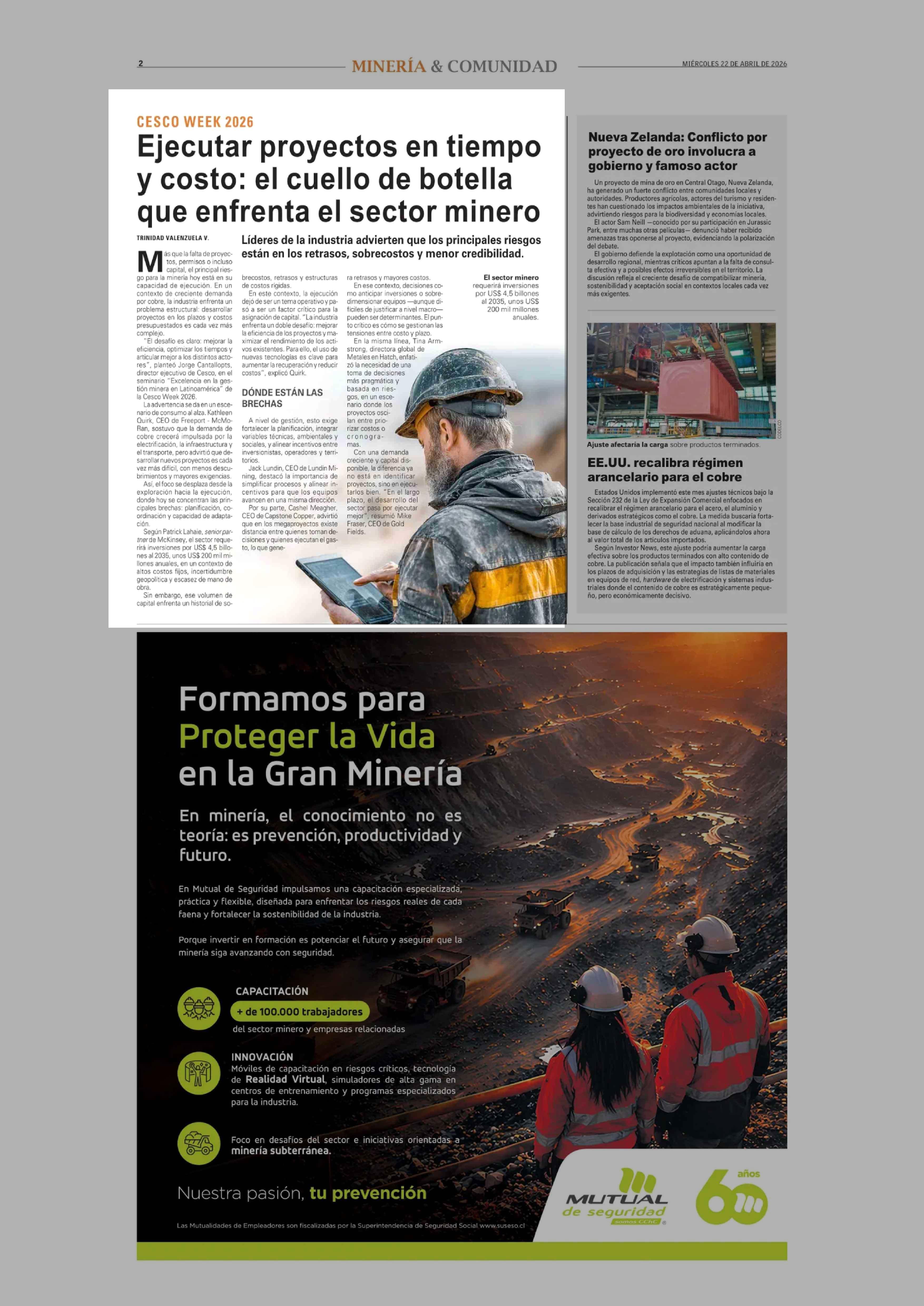 Ejecutar proyectos en tiempo y costo: el cuello de botella que enfrenta el sector minero 22-04-2026 El Mercurio |