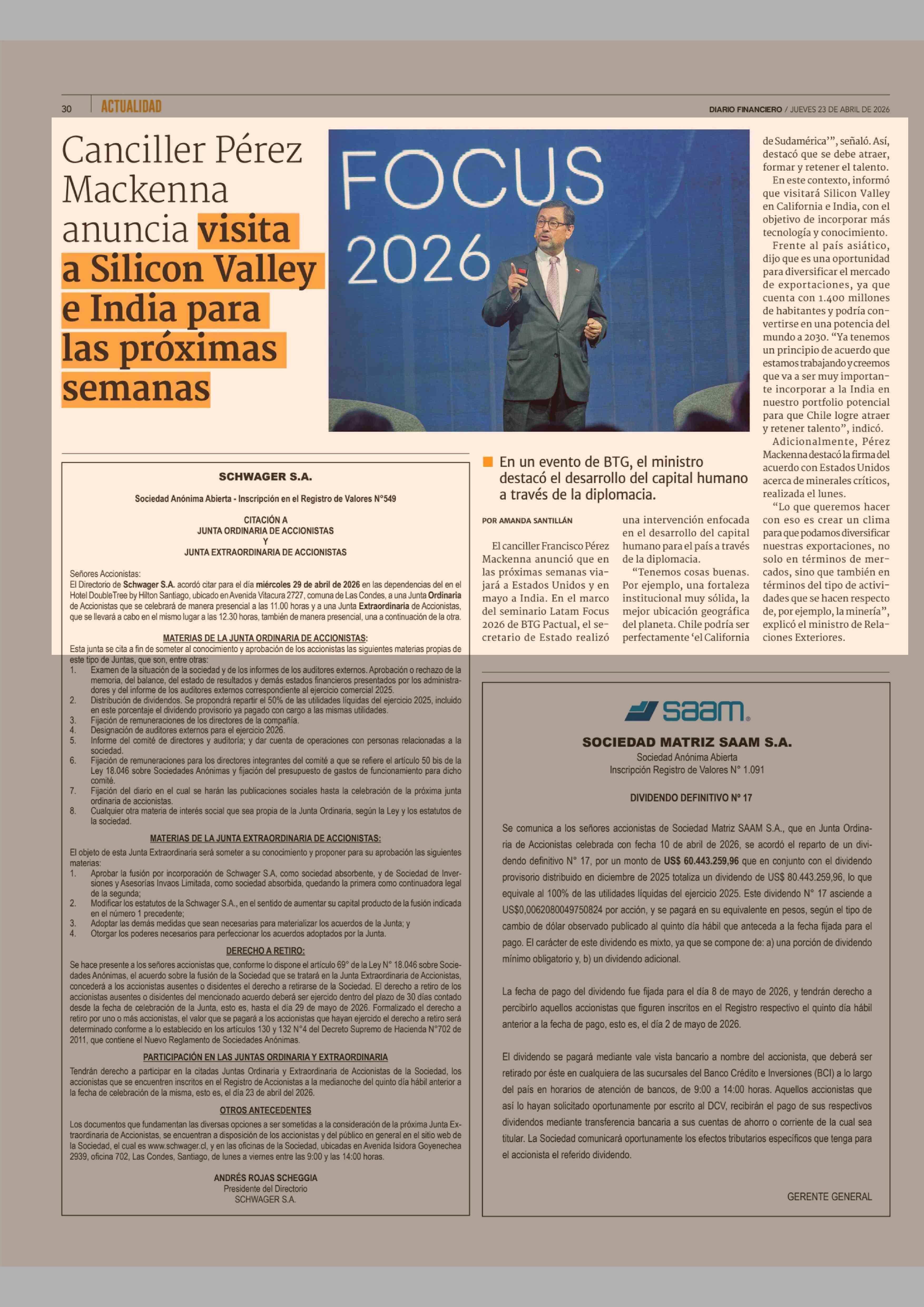 Canciller Pérez Mackenna anuncia visita a Silicon Valley e India para las próximas semanas 23-04-2026 Diario Financiero |