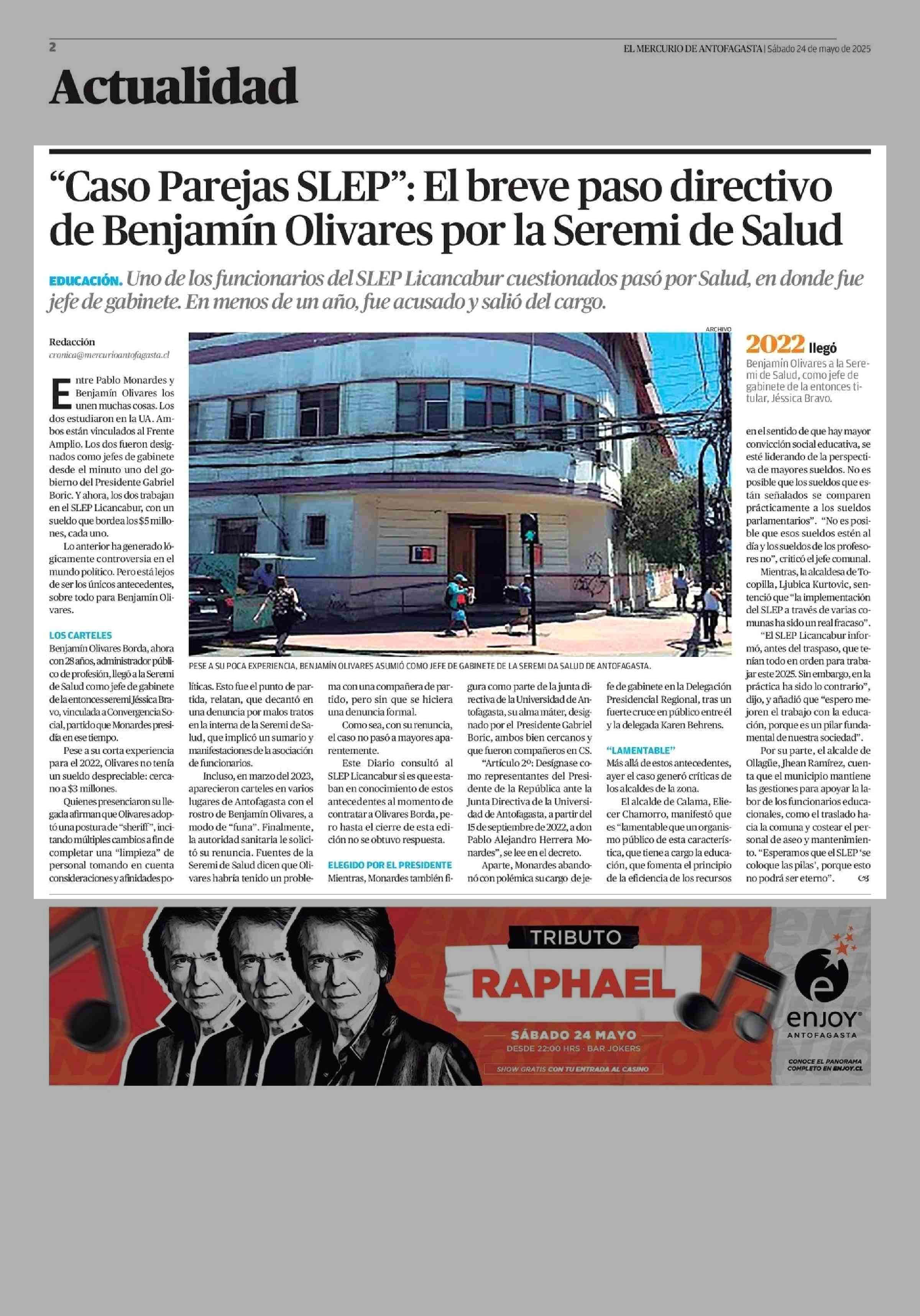 “Caso Parejas SLEP”: El breve paso directivo de Benjamín Olivares por la Seremi de Salud 24-05-2025 El Mercurio de Antofagasta |