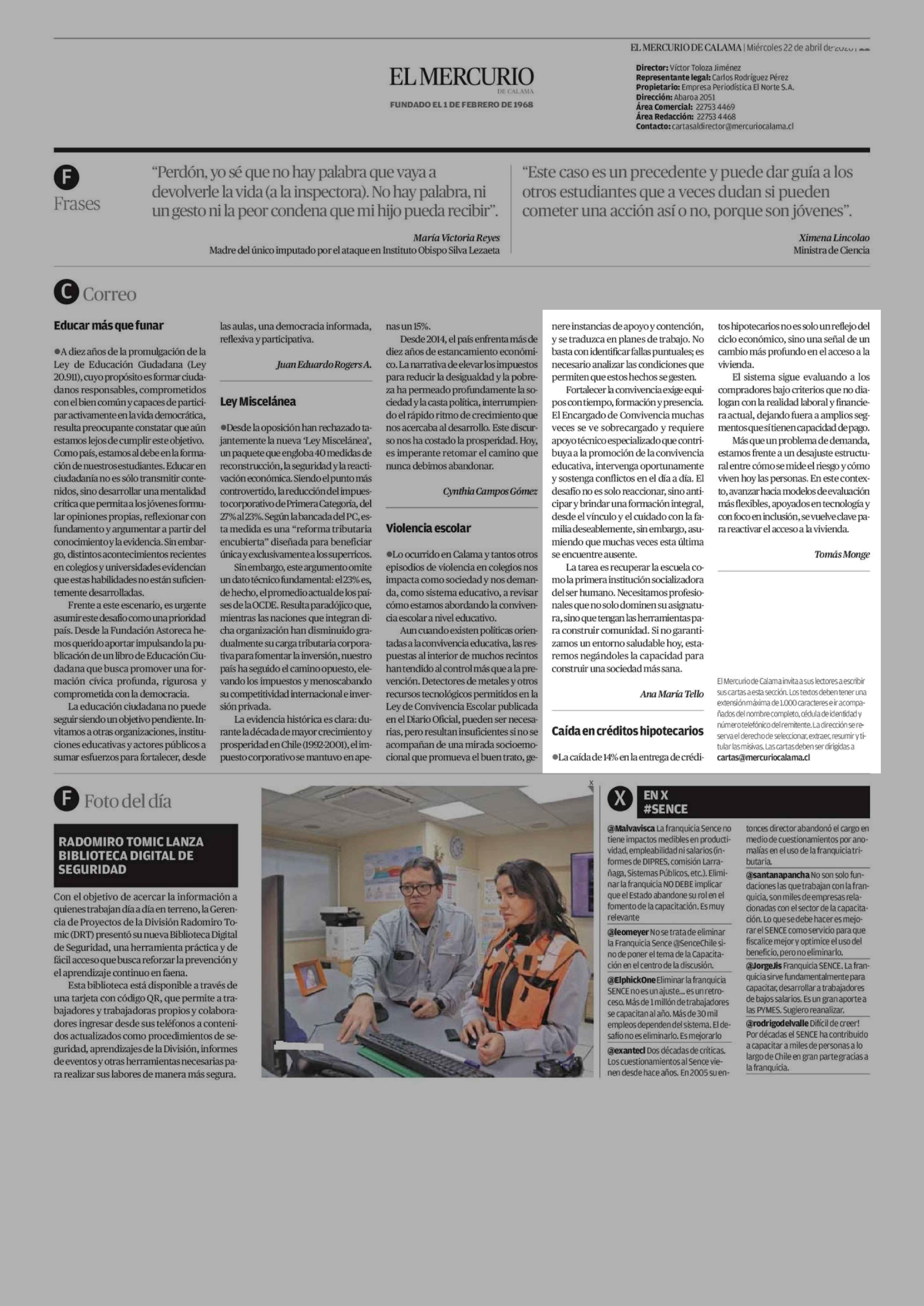Cartas: Caída en créditos hipotecarios 22-04-2026 El Mercurio de Calama |