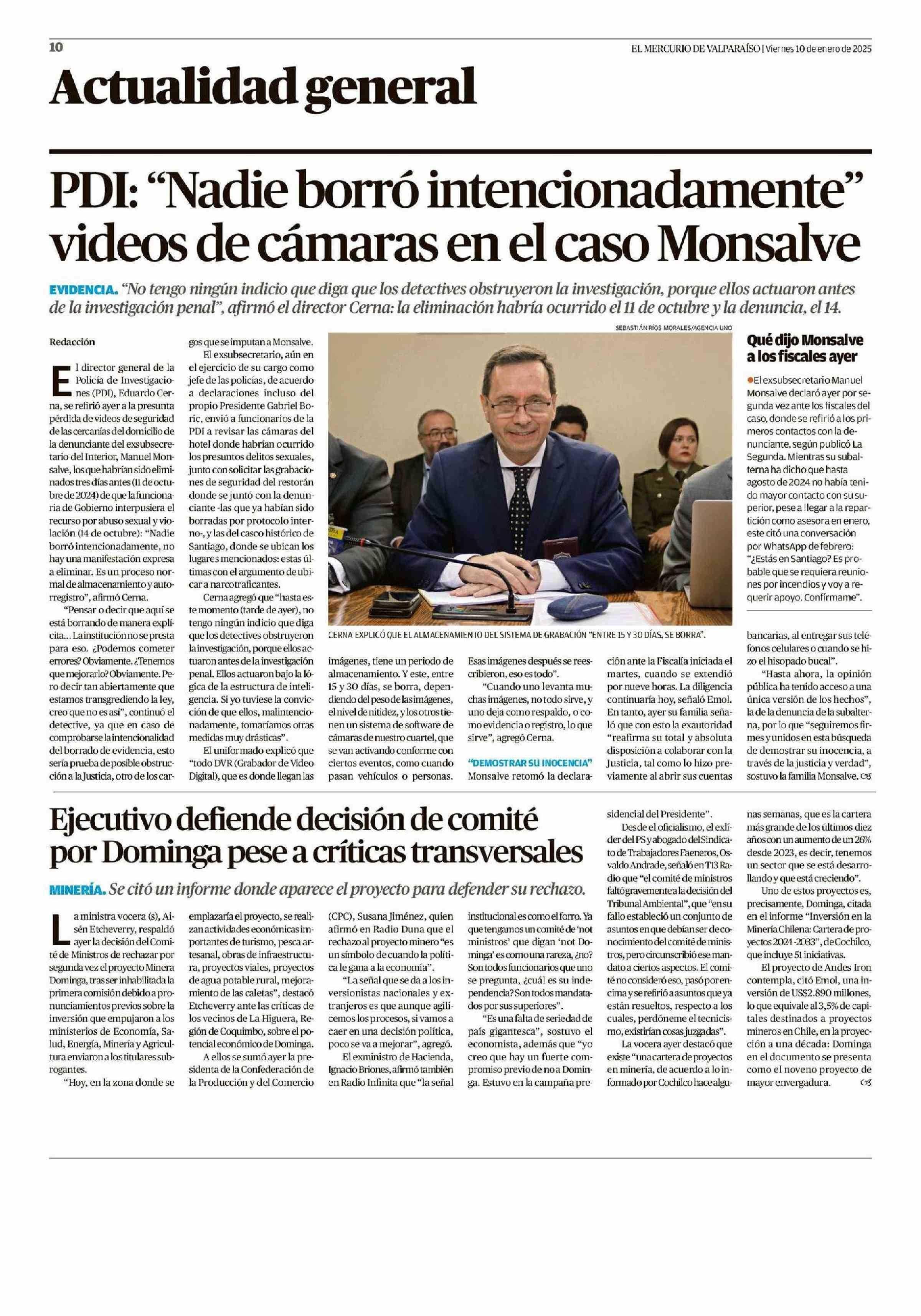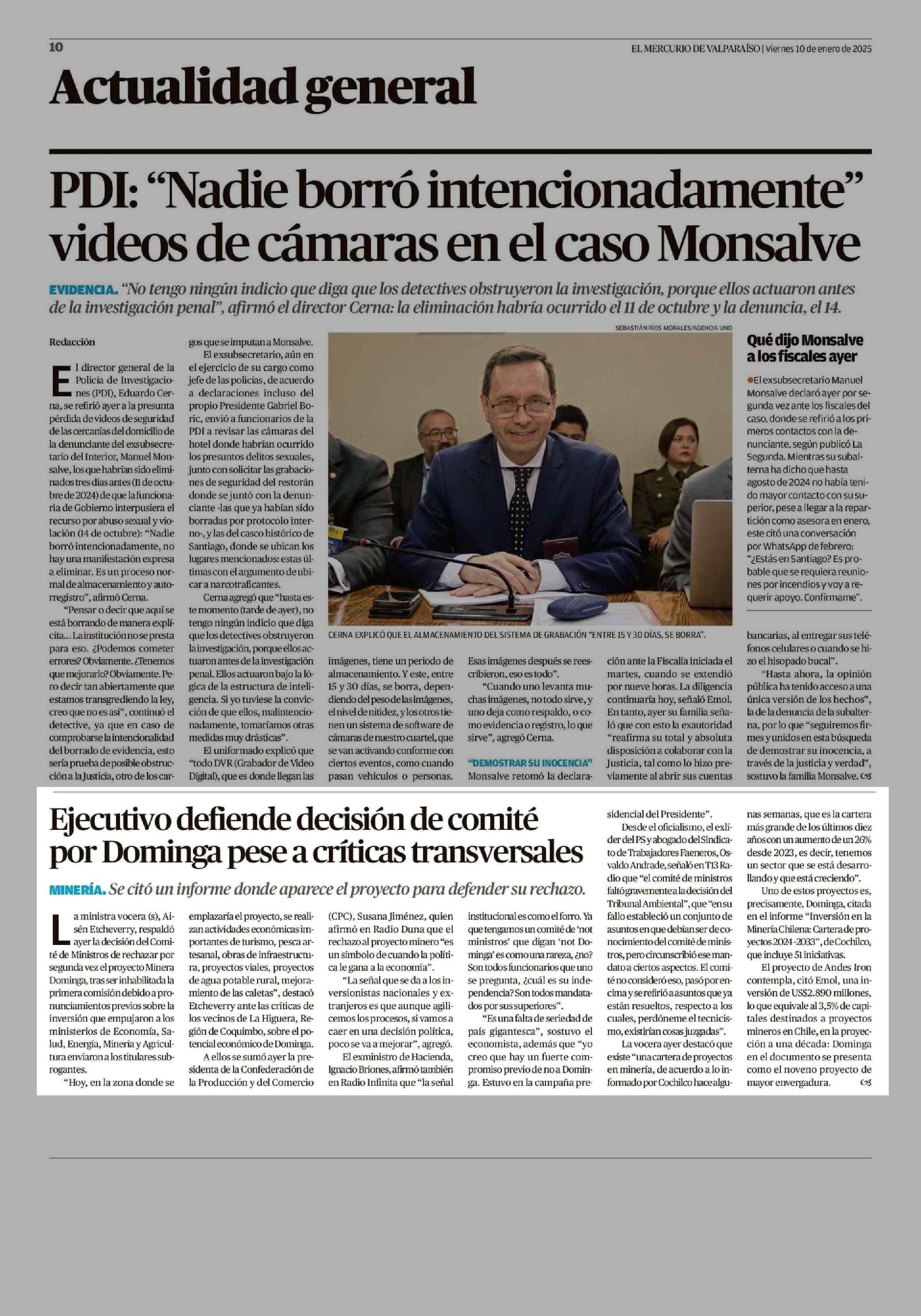 Ejecutivo defiende decisión de comité por Dominga pese a críticas transversales 10-01-2025 El Mercurio de Valparaíso |
