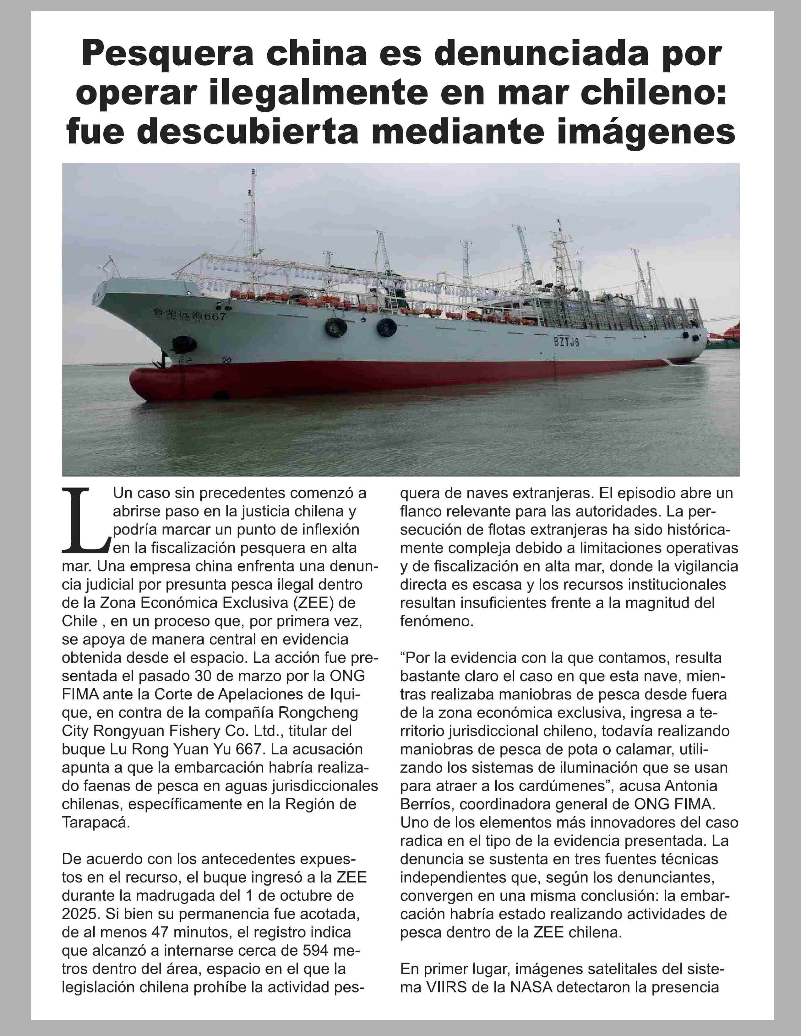 | Título: | Pesquera china es denunciada por operar ilegalmente en mar chileno: fue descubierta mediante imágenes |