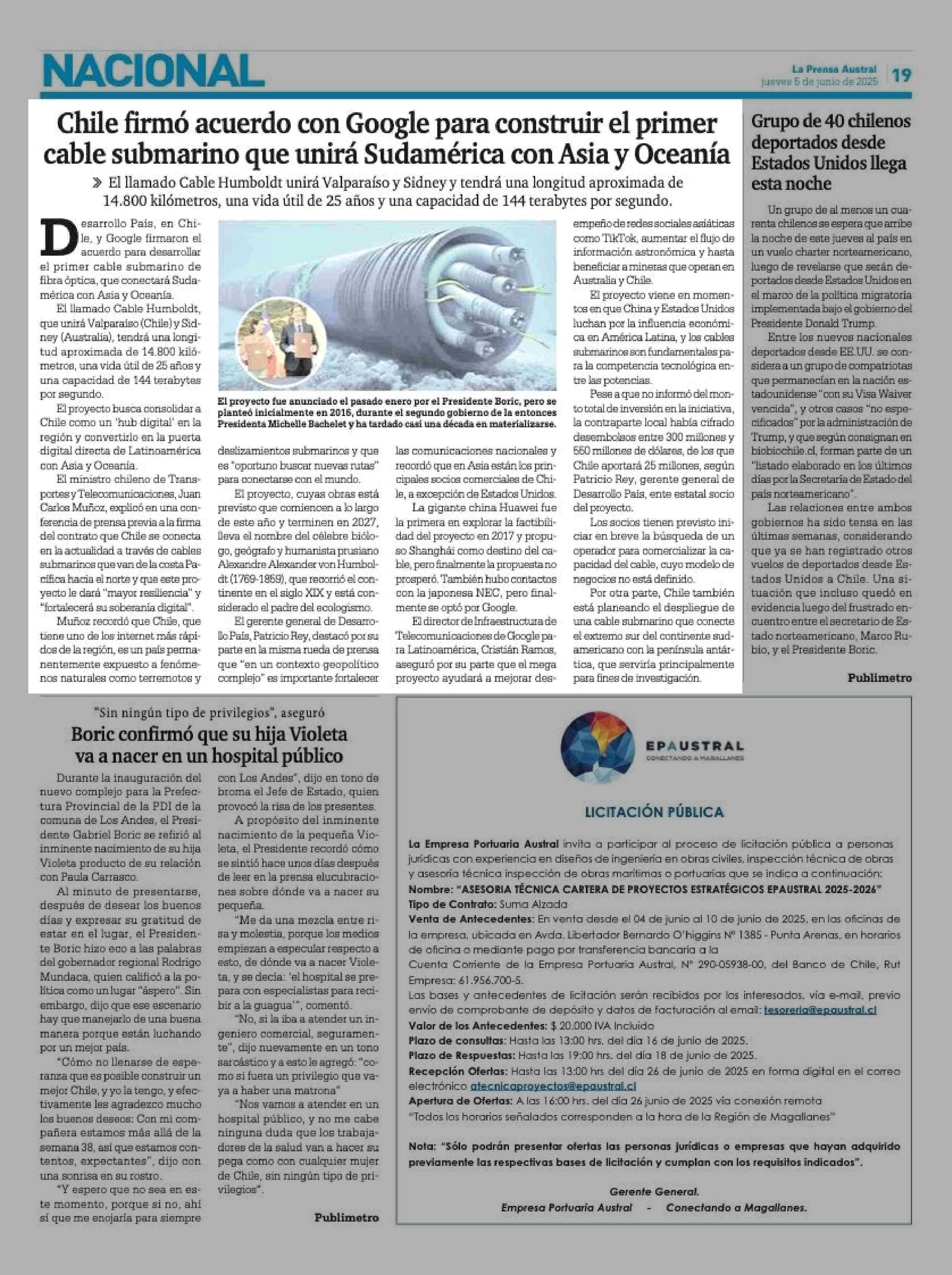 Chile firmó acuerdo con Google para construir el primer cable submarino que unirá Sudamérica con Asia y Oceanía 05-06-2025 La Prensa Austral |