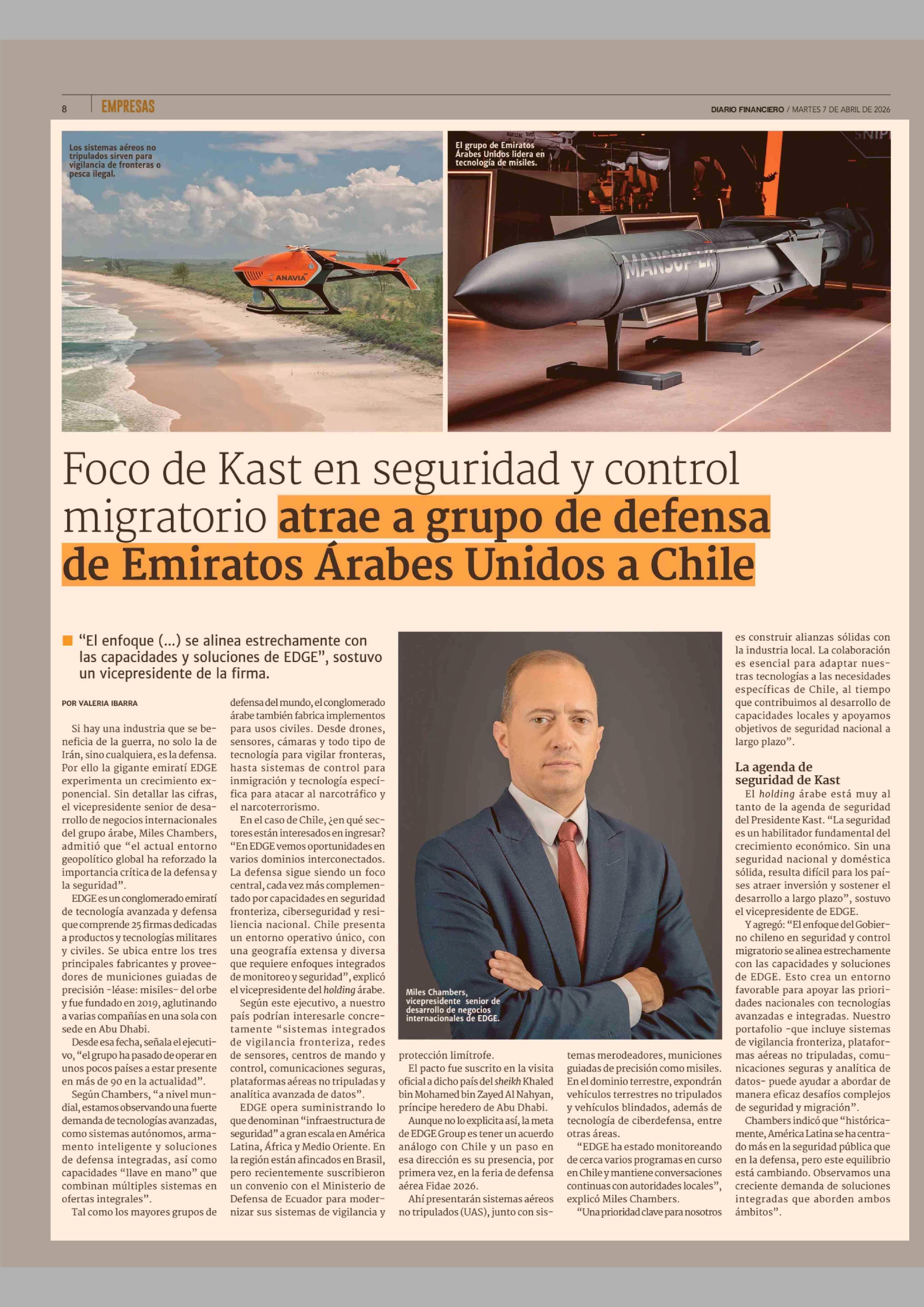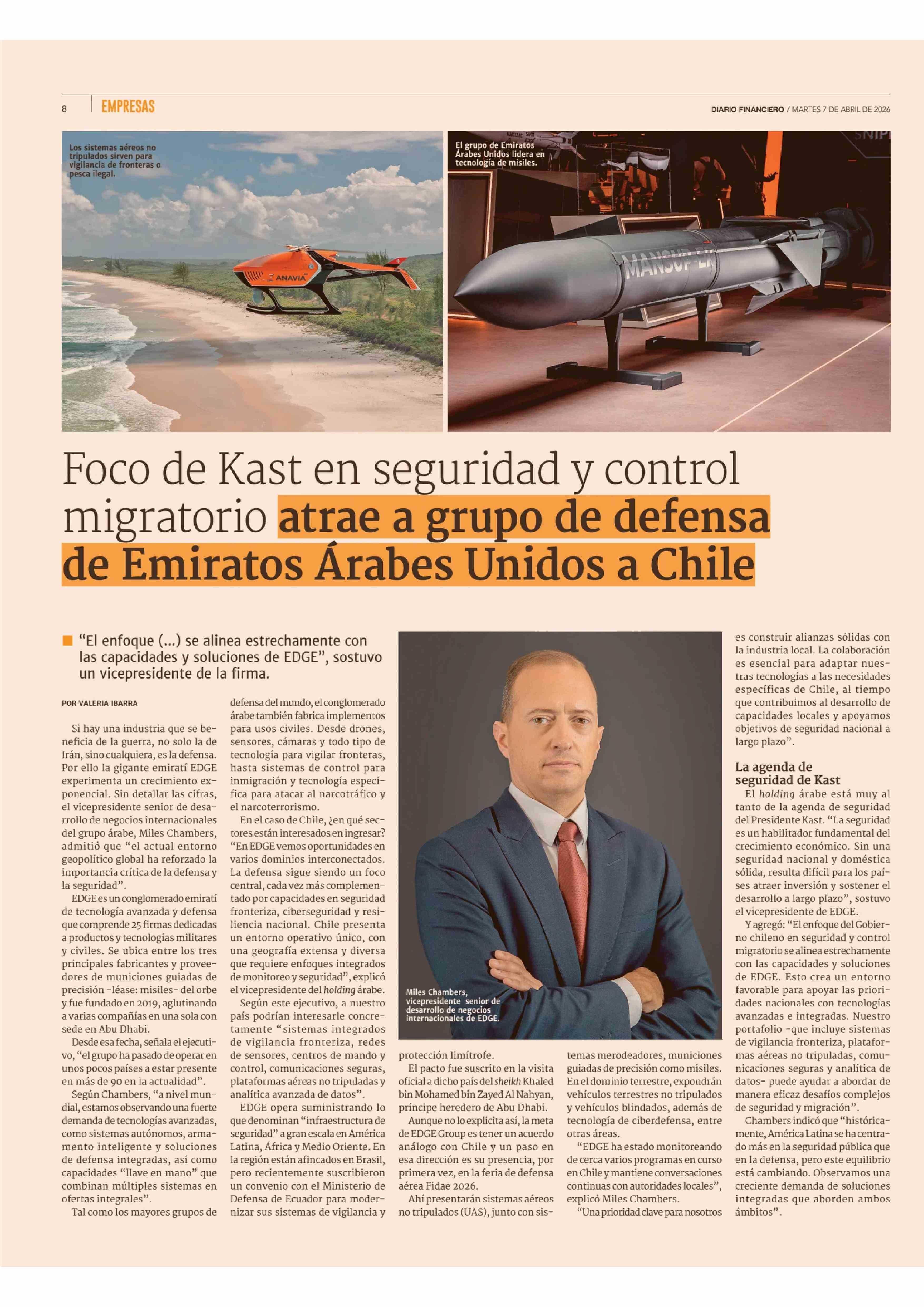 Título: Foco de Kast en seguridad y control migratorio atrae a grupo de defensa de Emiratos Árabes Unidos a Chile