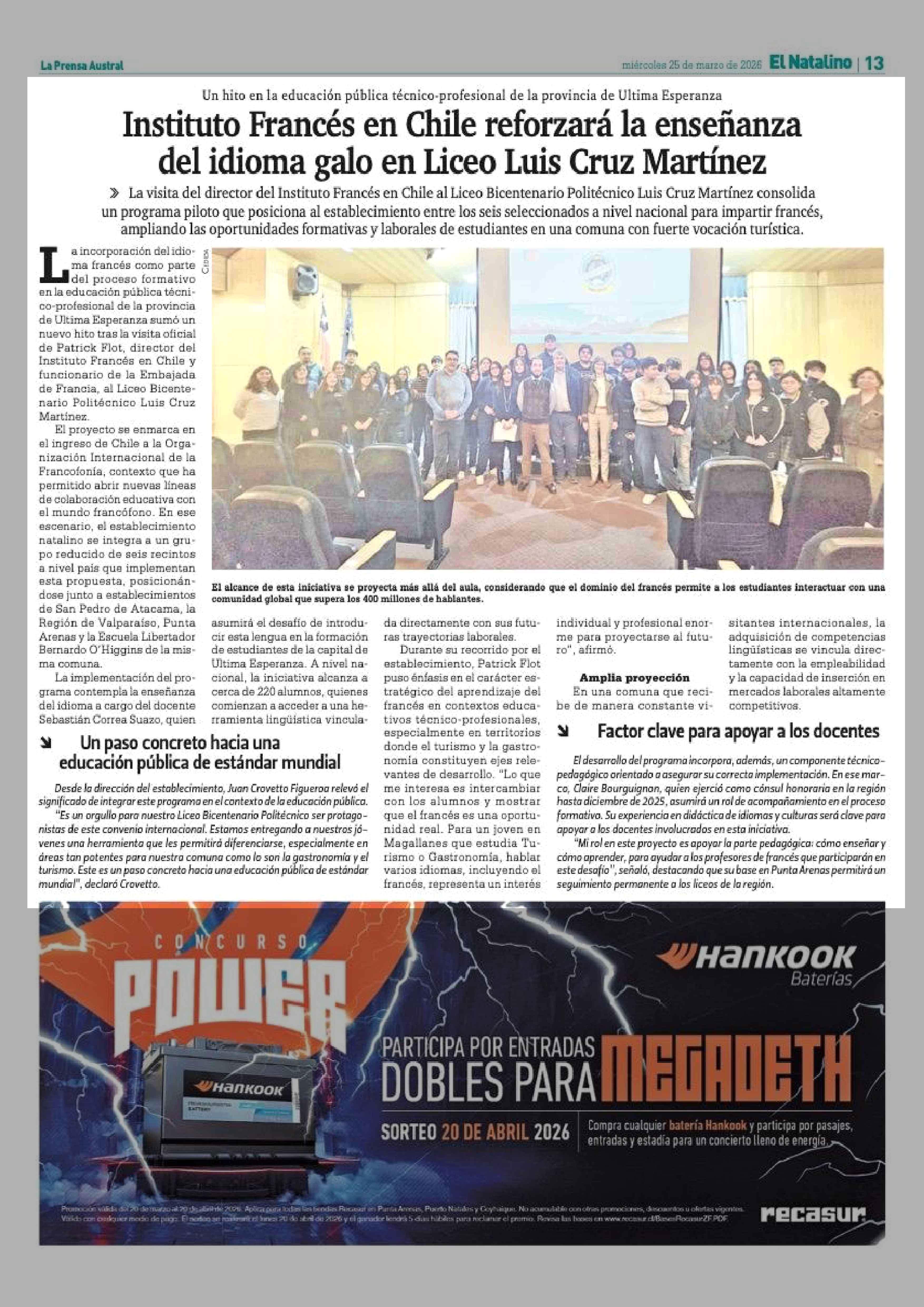 Instituto Francés en Chile reforzará la enseñanza del idioma galo en Liceo Luis Cruz Martínez 25-03-2026 La Prensa Austral |
