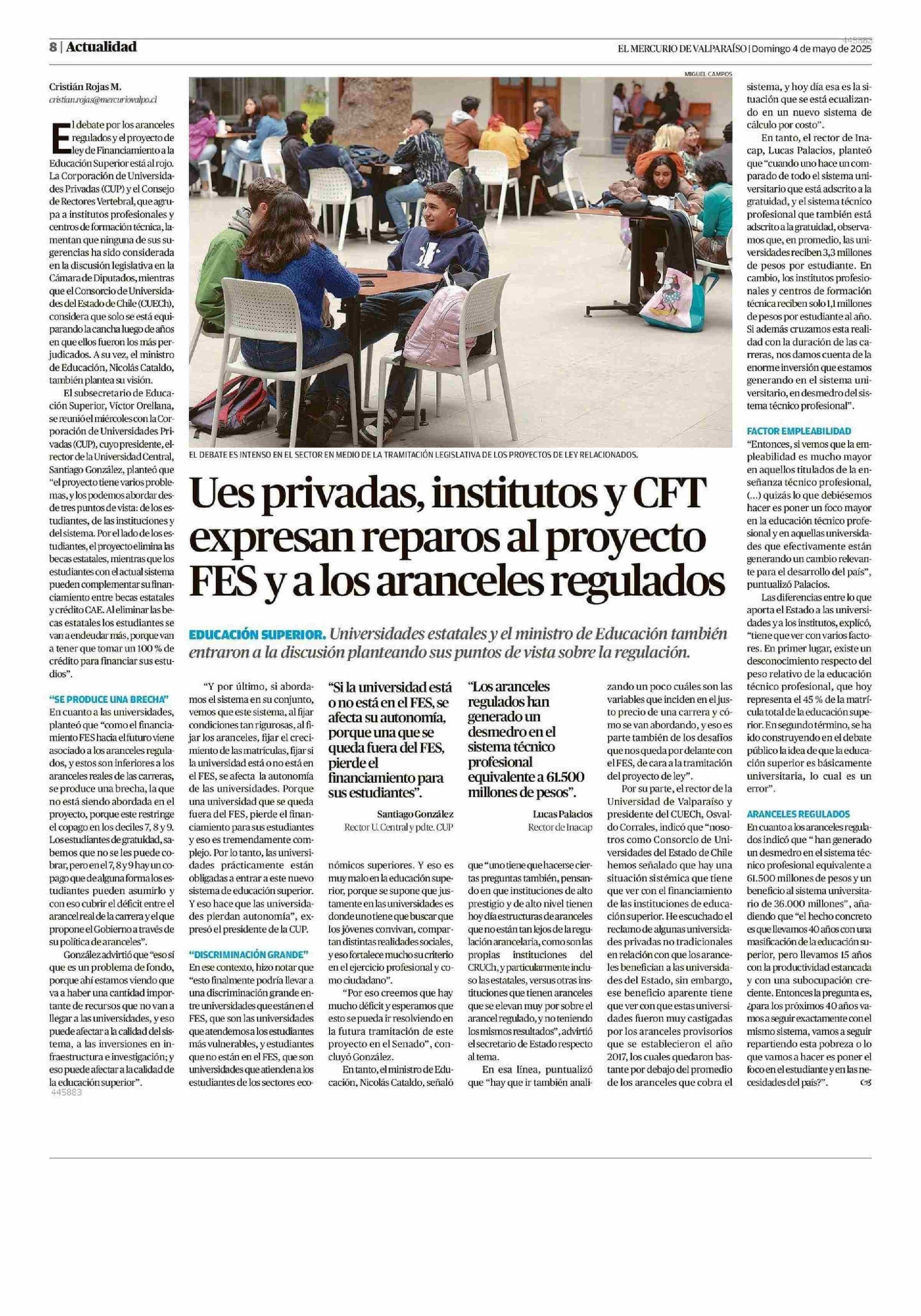 Ues privadas, institutos y CFT expresan reparos al proyecto FES y alos aranceles regulados 04-05-2025 El Mercurio de Valparaíso |