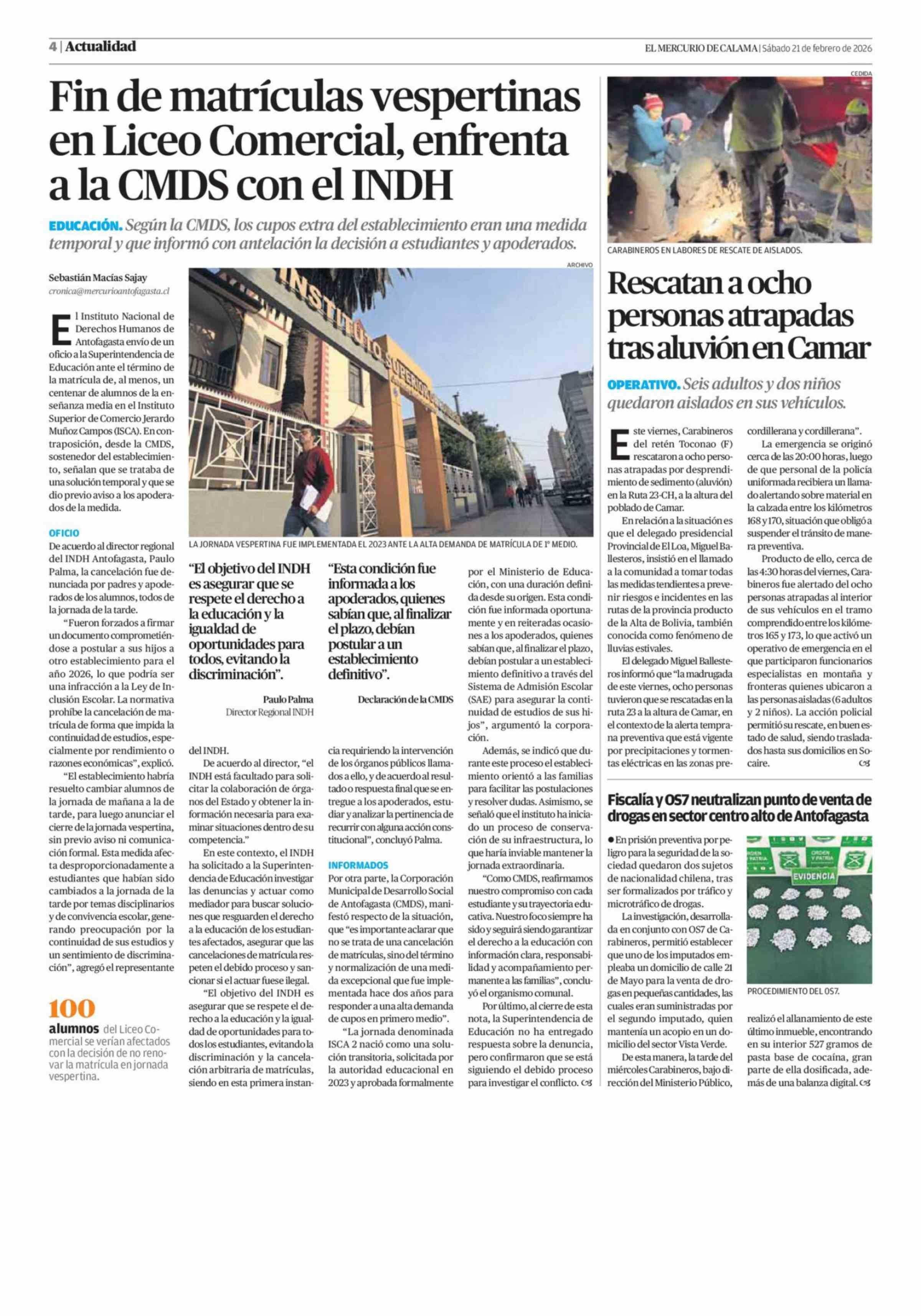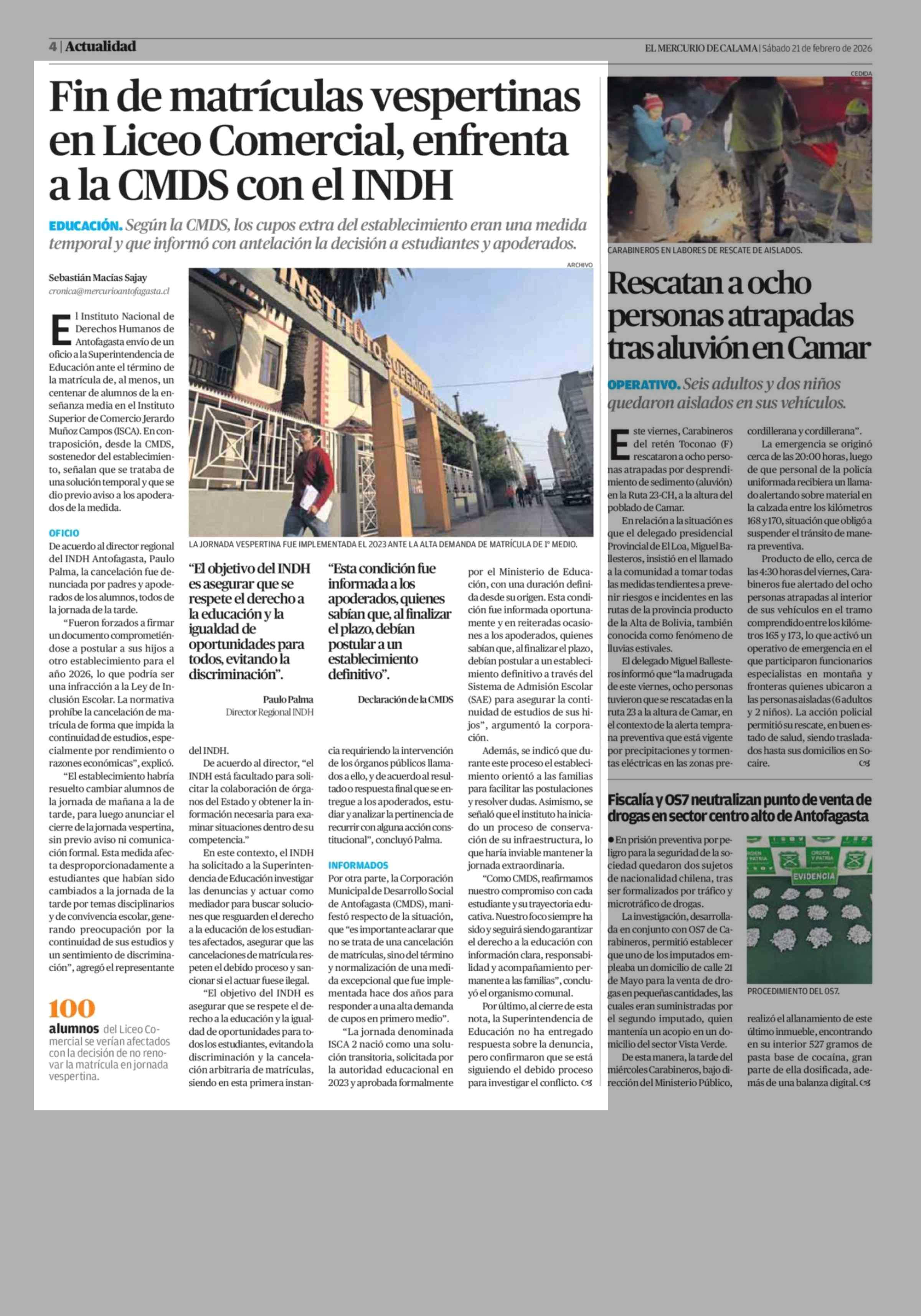 Fin de matrículas vespertinas en Liceo Comercial, enfrenta a la CMDS con el INDH 21-02-2026 El Mercurio de Calama |