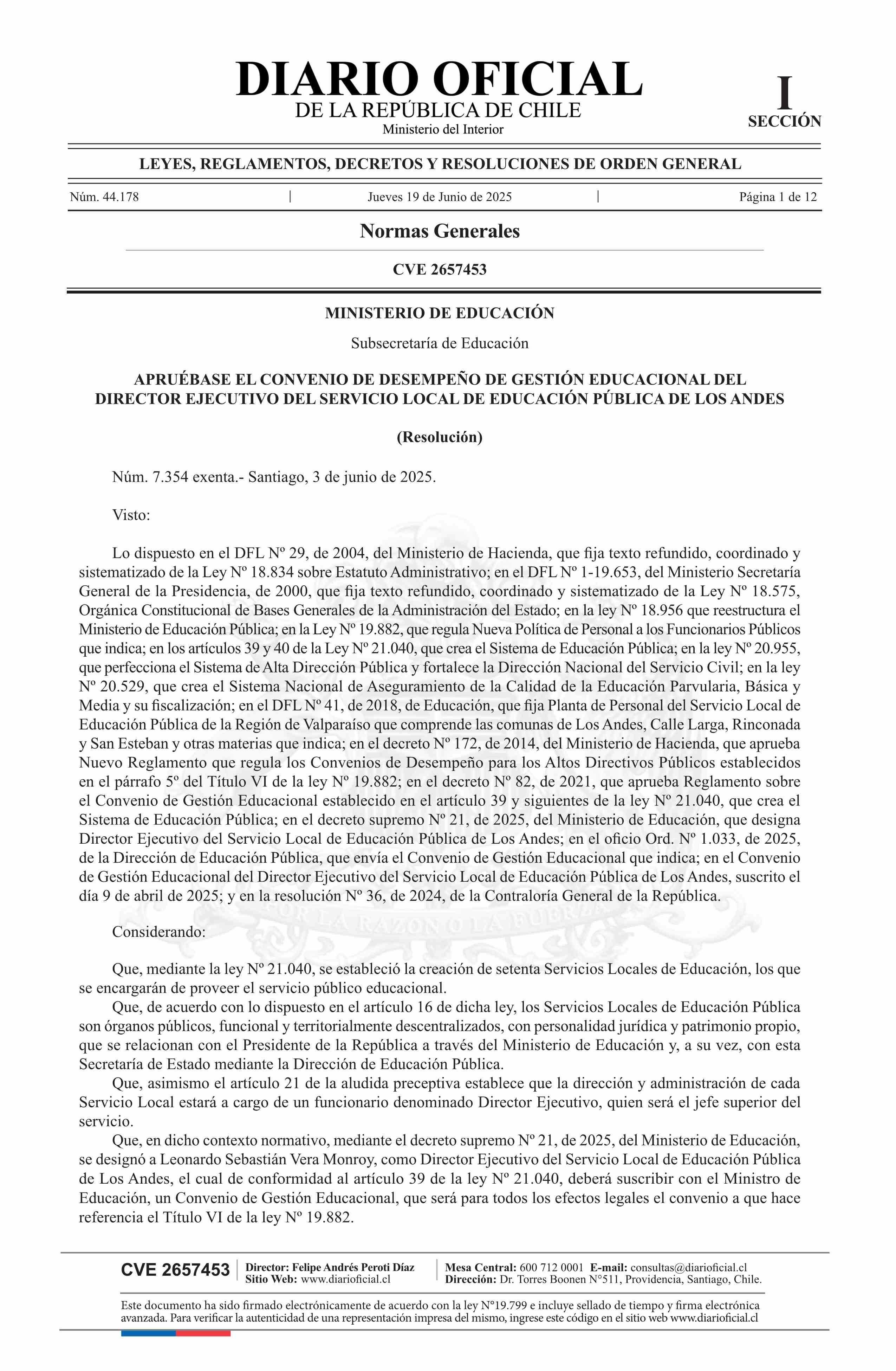 Resolución exenta número 7.354, de 2025.- Aprueba Convenio de Desempeño de Gestión Educacional del Director Ejecutivo del Servicio Local de Educación Pública de Los Andes 19-06-2025 Diario Oficial Edición Electrónica |