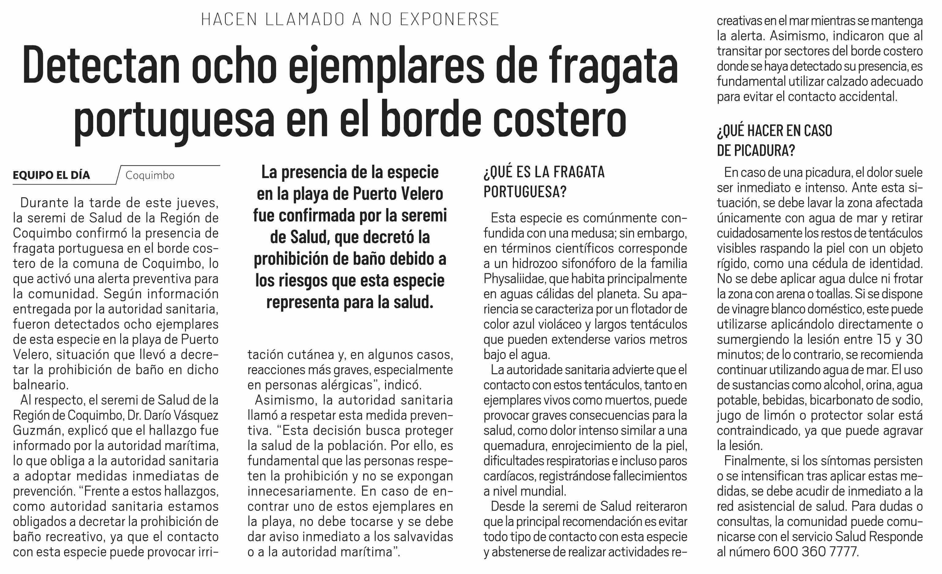 | Título: | Detectan ocho ejemplares de fragata portuguesa en el borde costero |