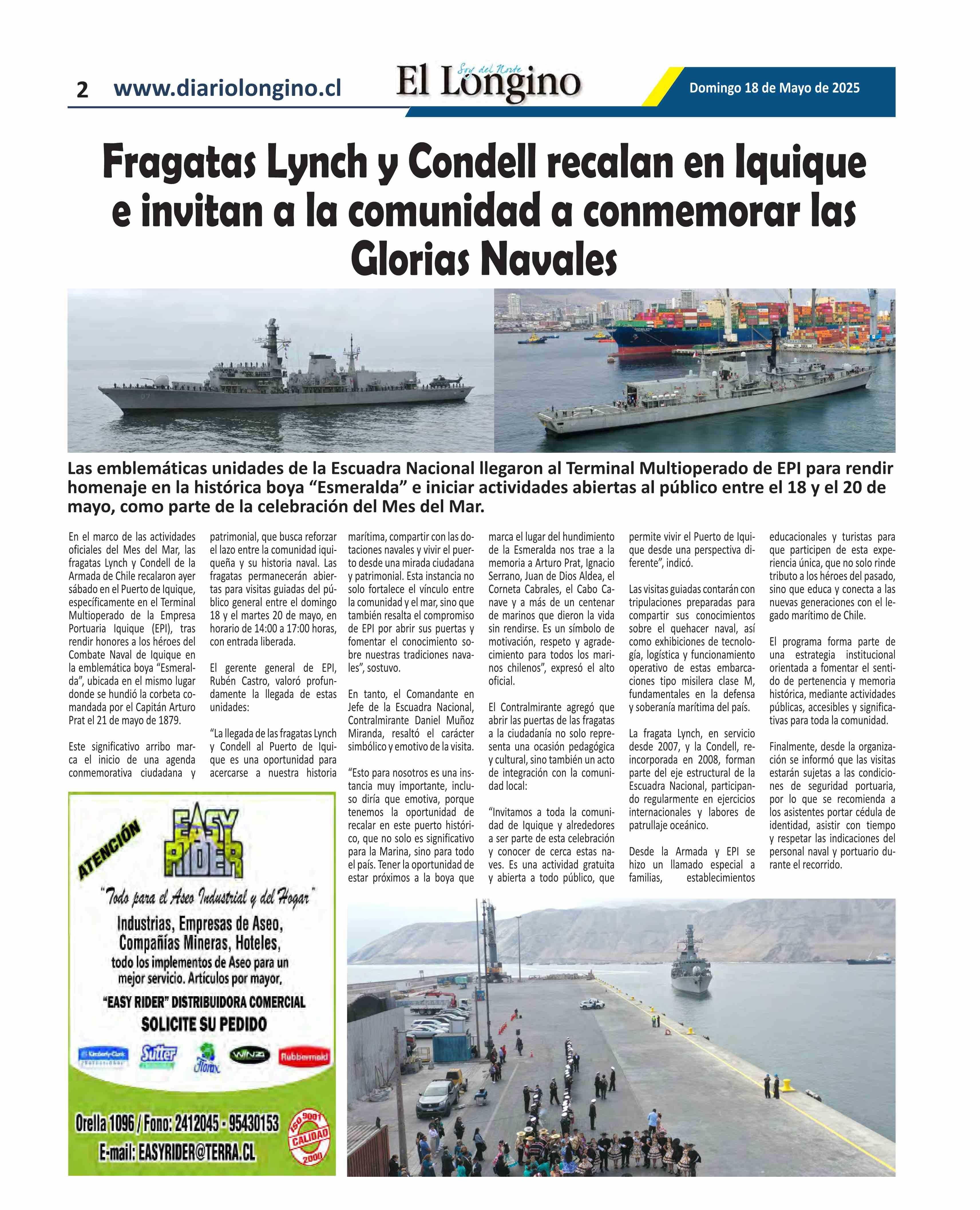 Fragatas Lynch y Condell recalan en Iquique e invitan a la comunidad a conmemorar las Glorias Navales 18-05-2025 El Longino |