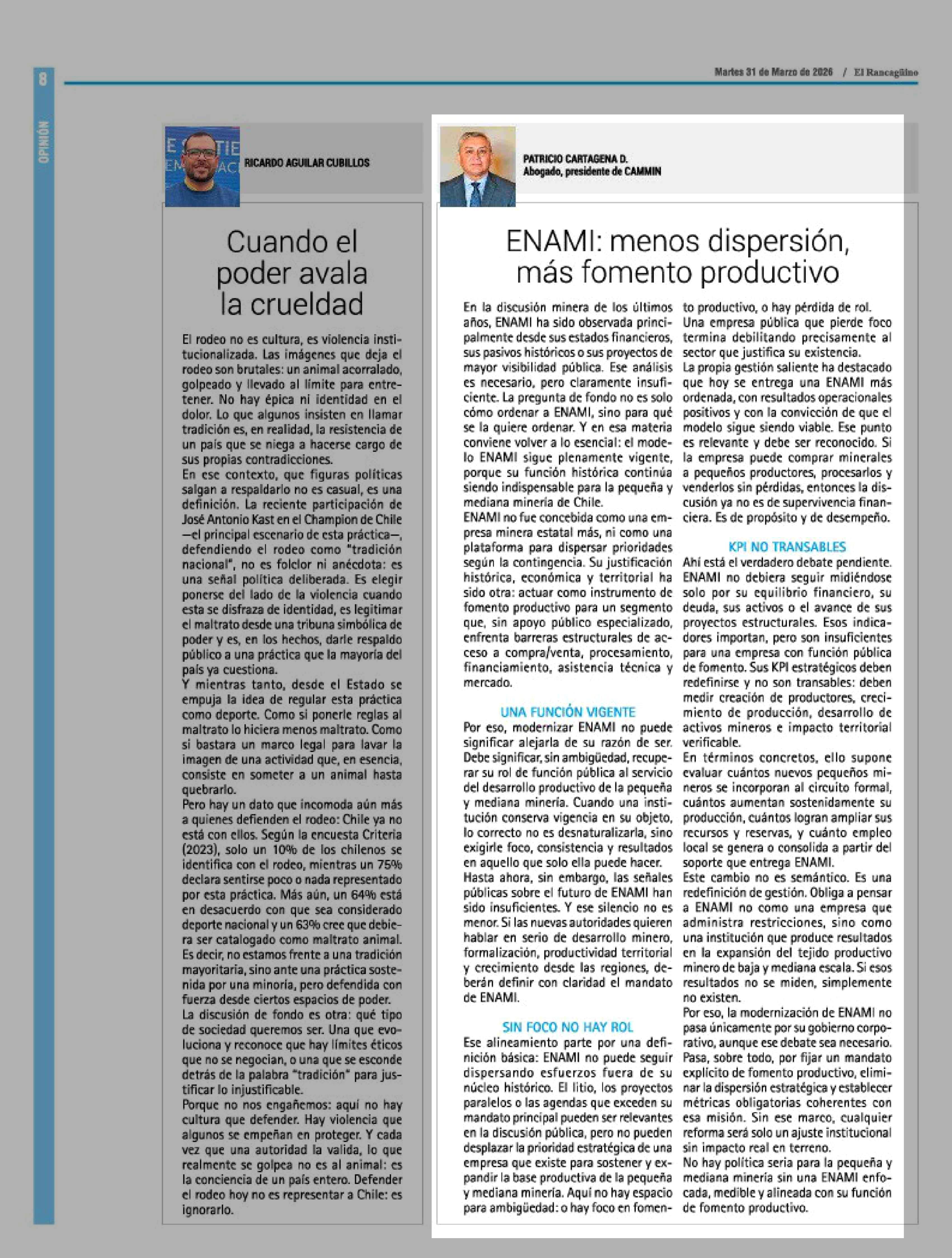 Título: Columnas de Opinión: ENAMI: menos dispersión, más fomento productivo