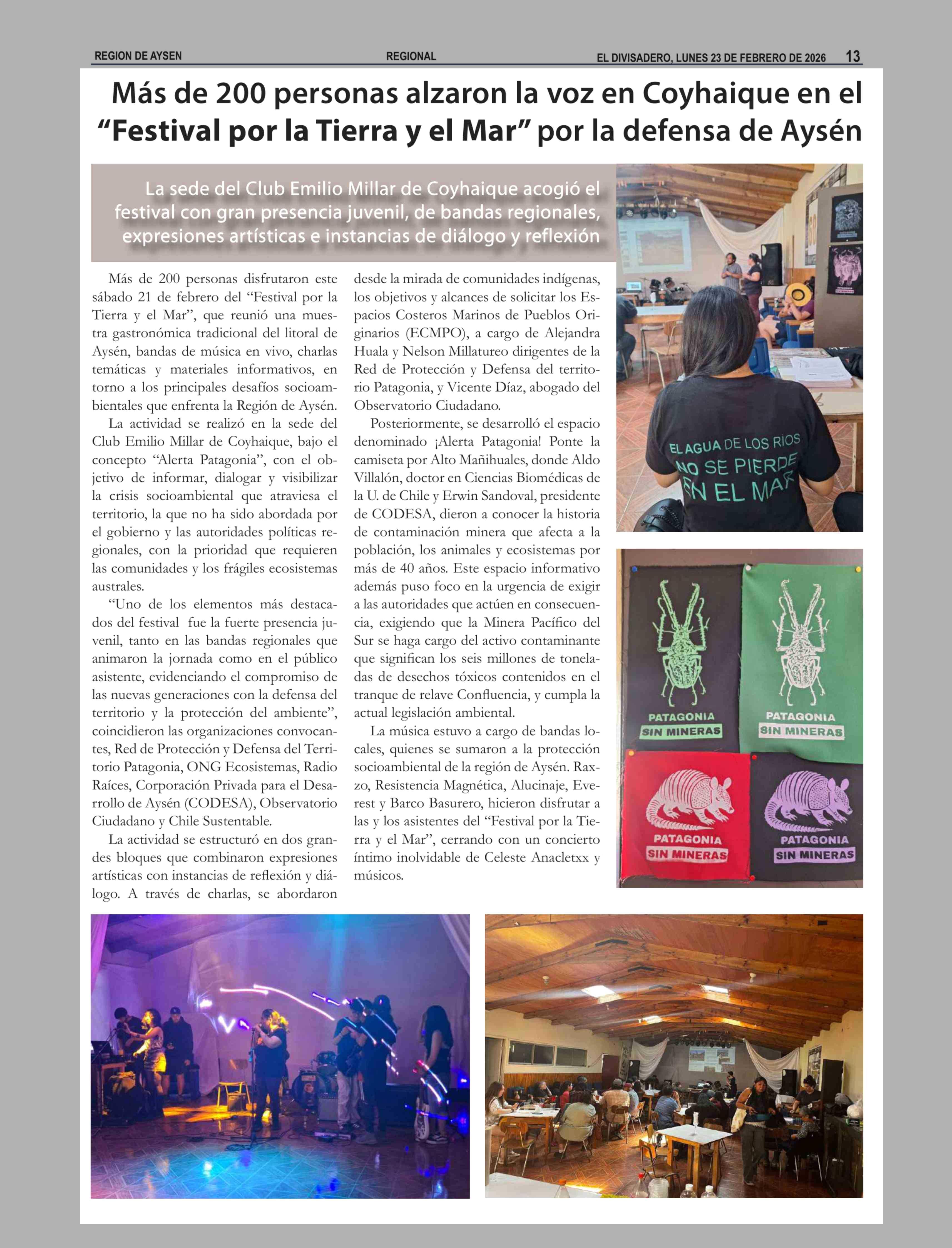 Más de 200 personas alzaron la voz en Coyhaique en el "Festival por la Tierra y el Mar" por la defensa de Aysén 23-02-2026 El Divisadero |