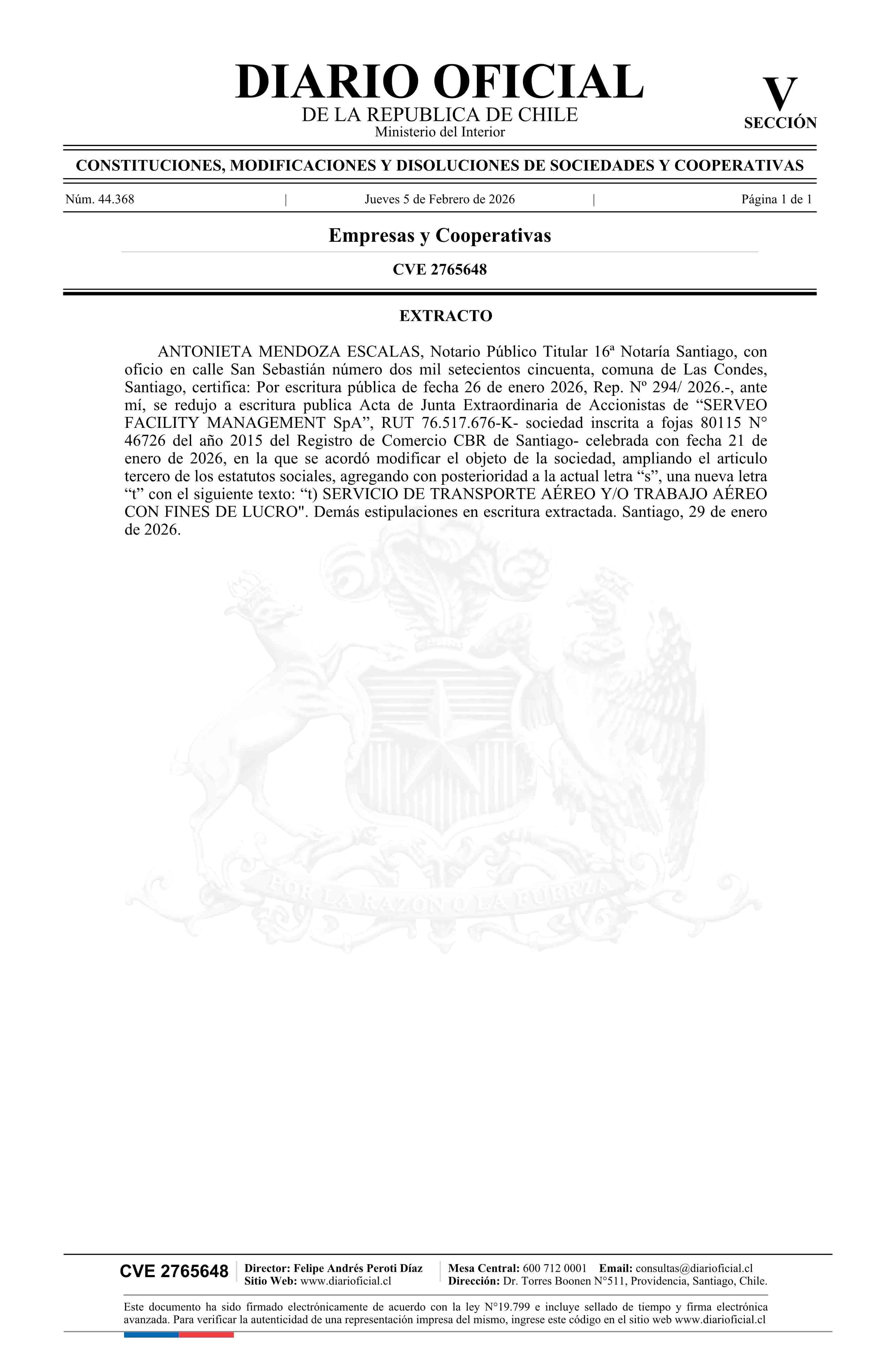 Serveo Facility Management SpA 76.517.676-K 05-02-2026 Diario Oficial Edición Electrónica |