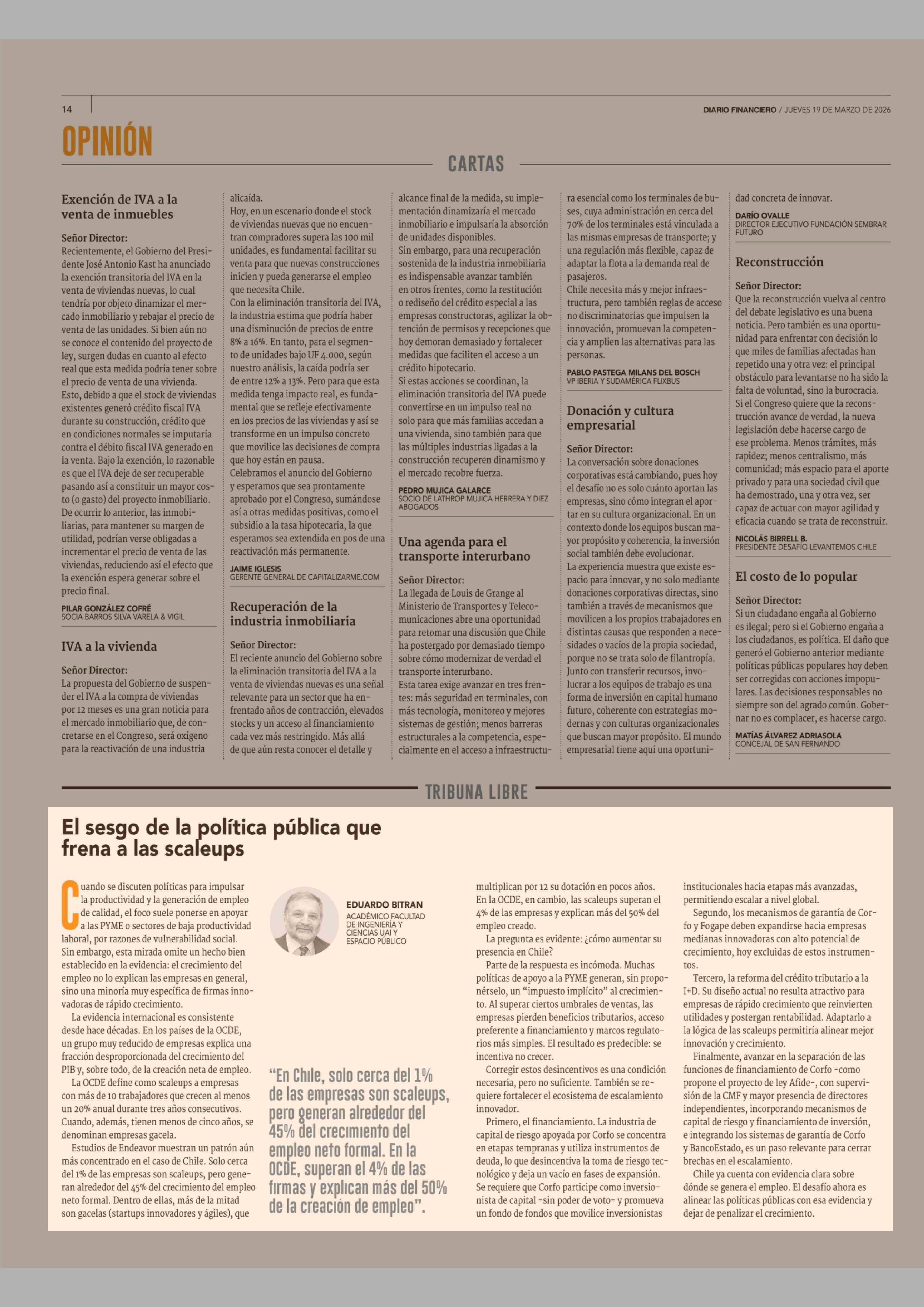 Columnas de Opinión: El sesgo de la política pública que frena a las scaleups 19-03-2026 Diario Financiero |
