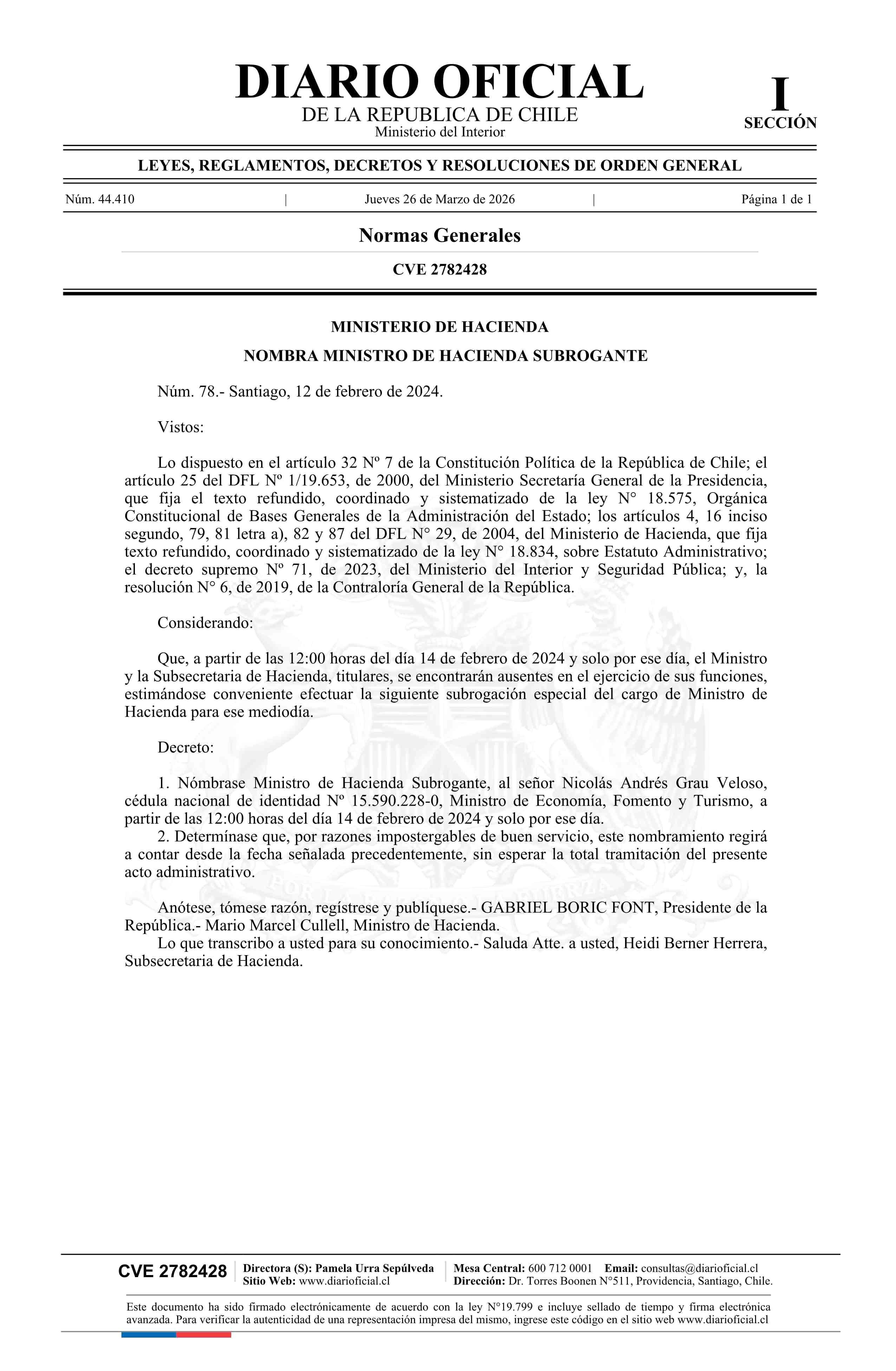Decreto número 78, de 2024.- Nombra a don Nicolás Andrés Grau Velasco como Ministro de Hacienda Subrogante 26-03-2026 Diario Oficial Edición Electrónica |