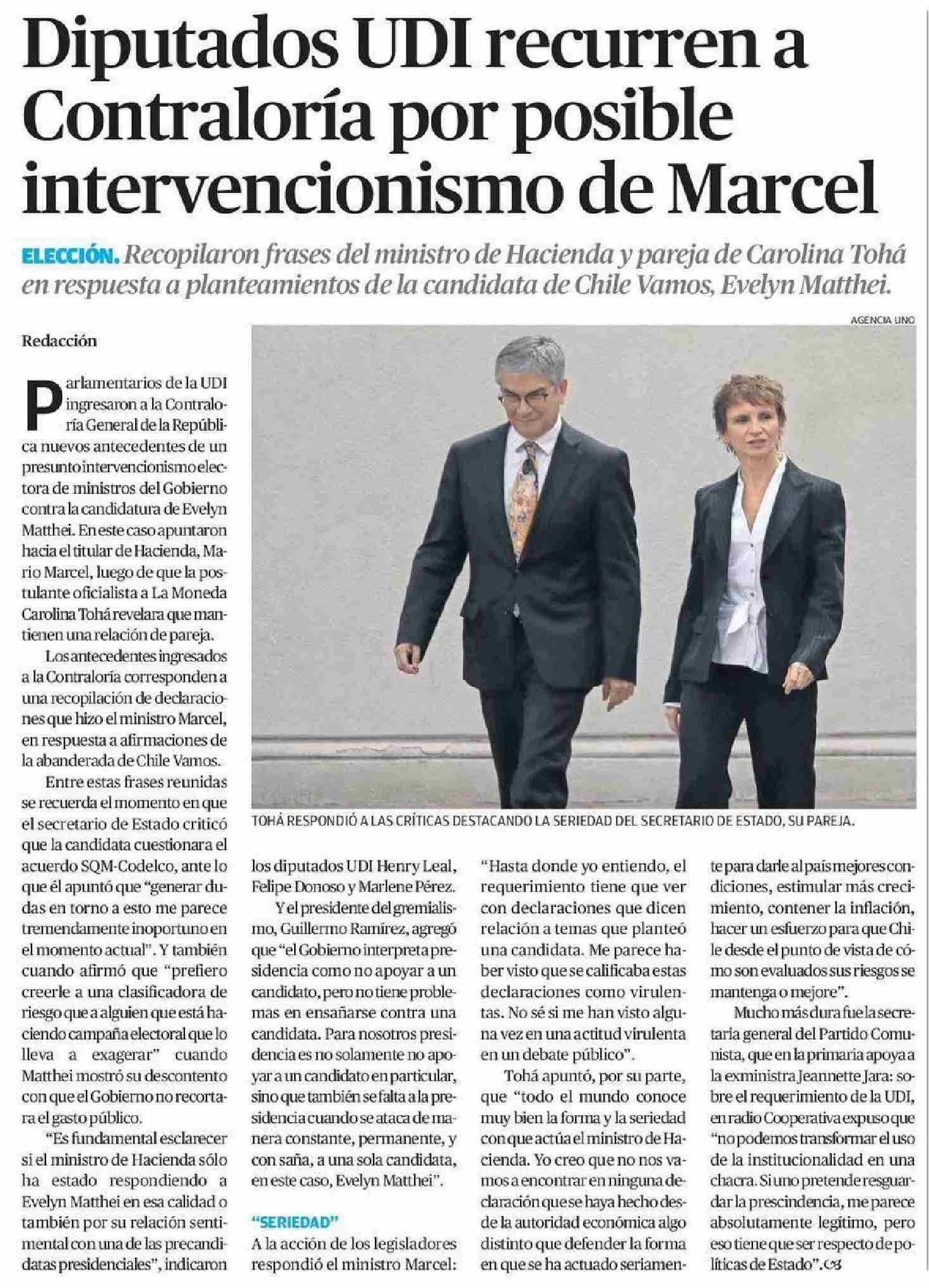| Título: | Diputados UDI recurren a Contraloría por posible intervencionismo de Marcel |