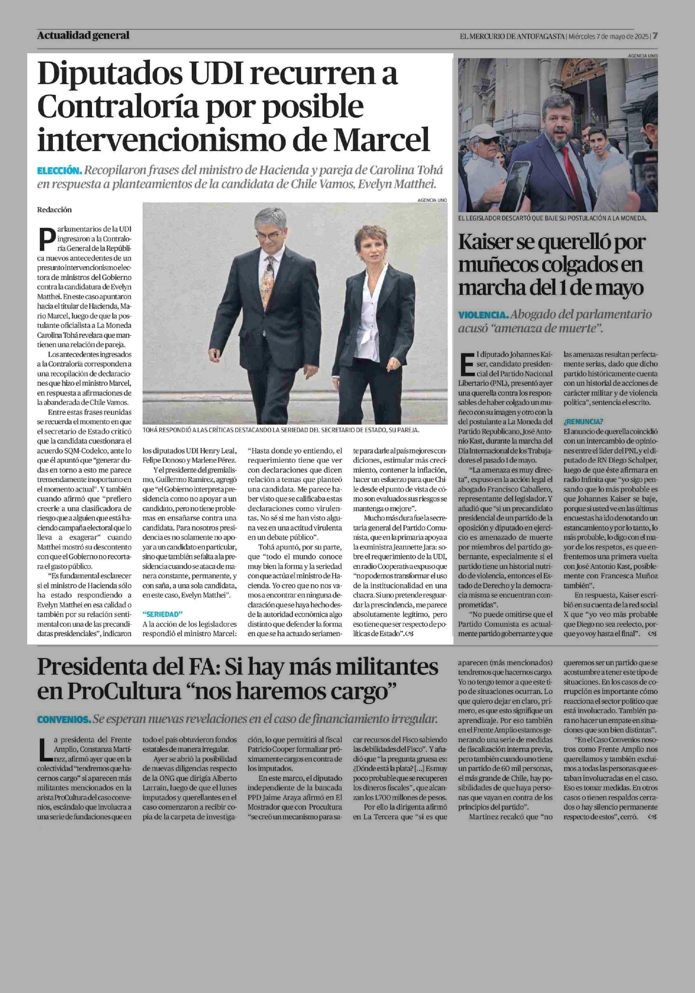 Diputados UDI recurren a Contraloría por posible intervencionismo de Marcel 07-05-2025 El Mercurio de Antofagasta |