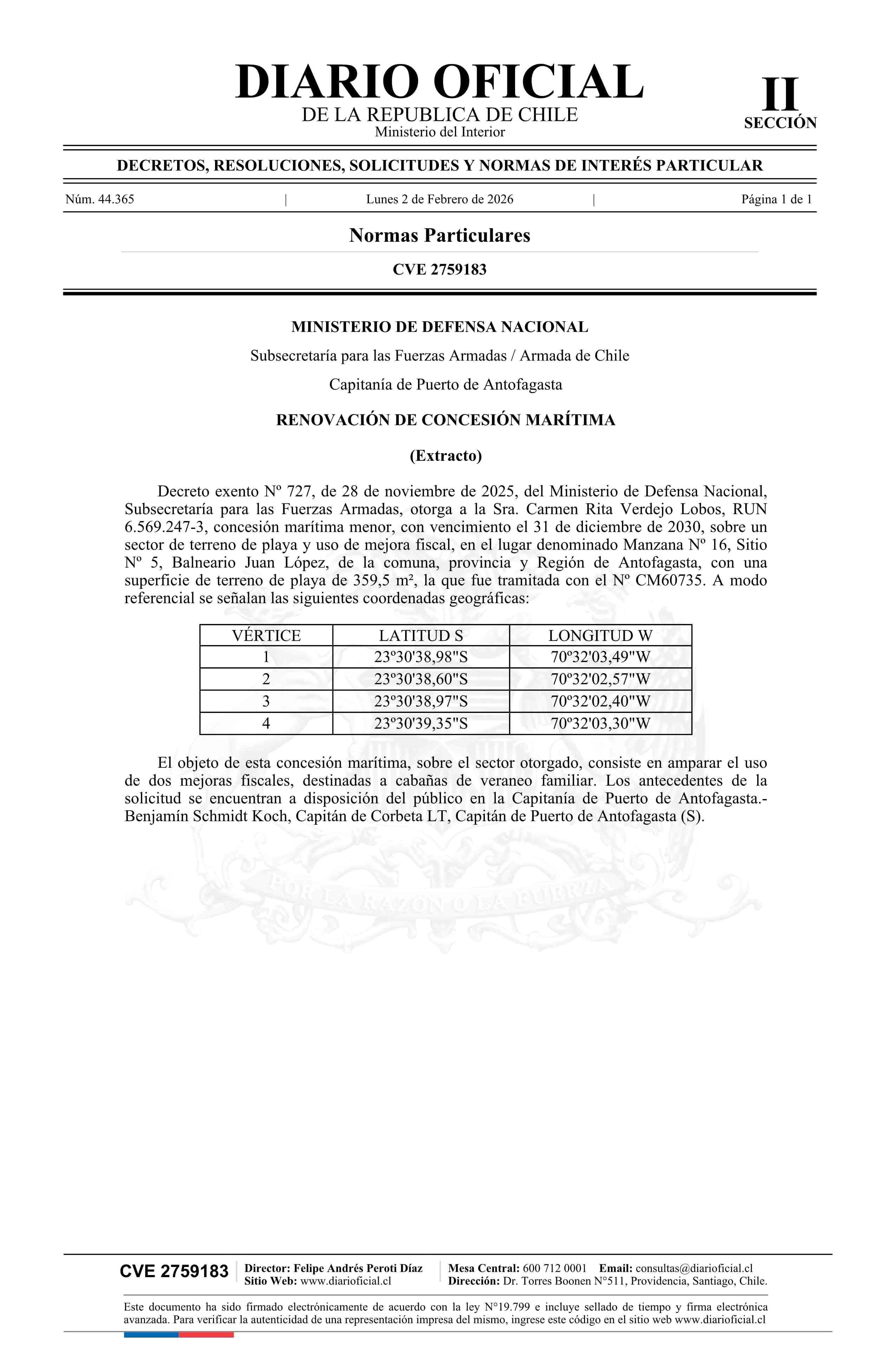 Extracto de decreto exento número 727, de 2025.- Renovación de concesión marítima menor 02-02-2026 Diario Oficial Edición Electrónica |