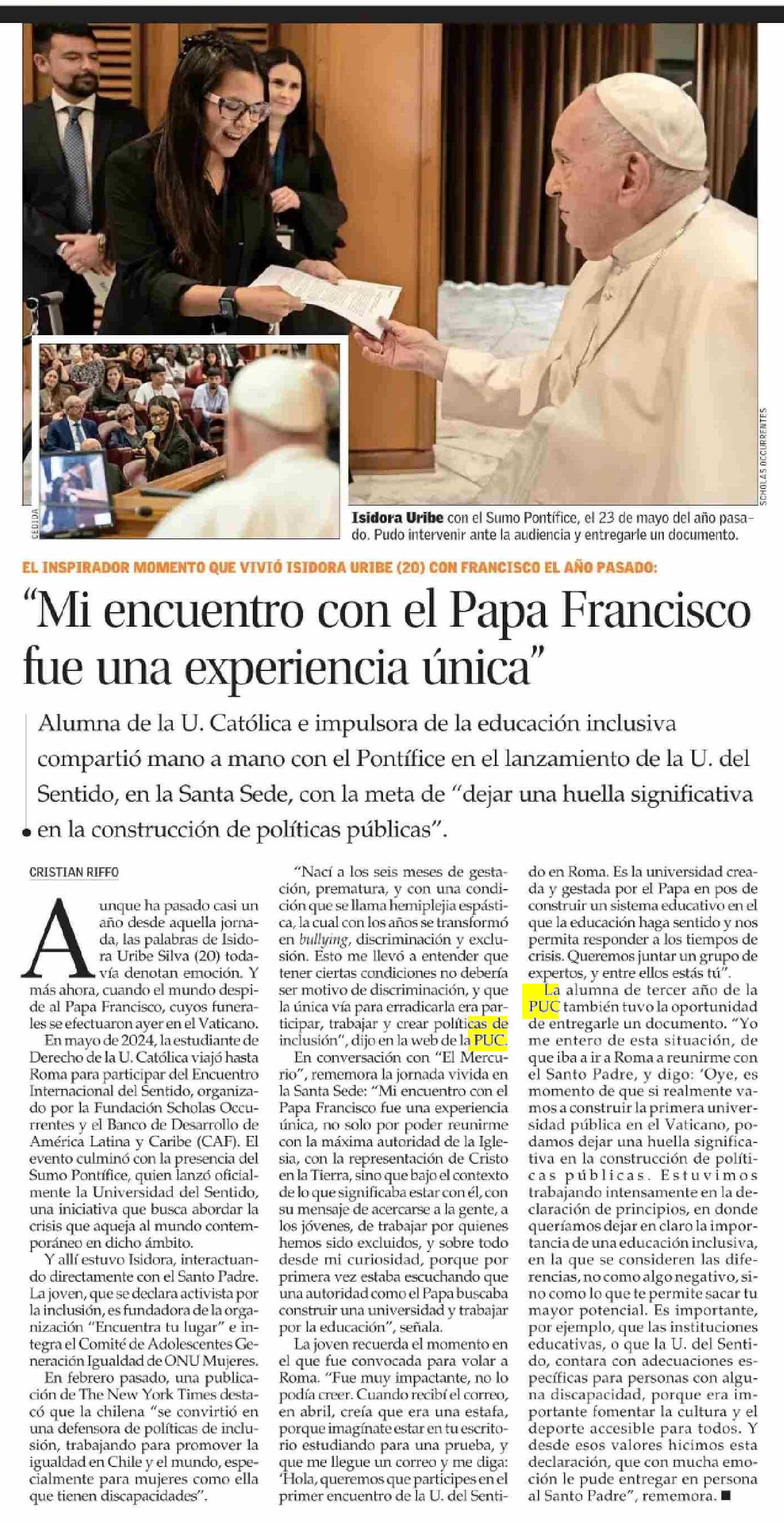 “Mi encuentro con el Papa Francisco fue una experiencia única” 27-04-2025 El Mercurio |