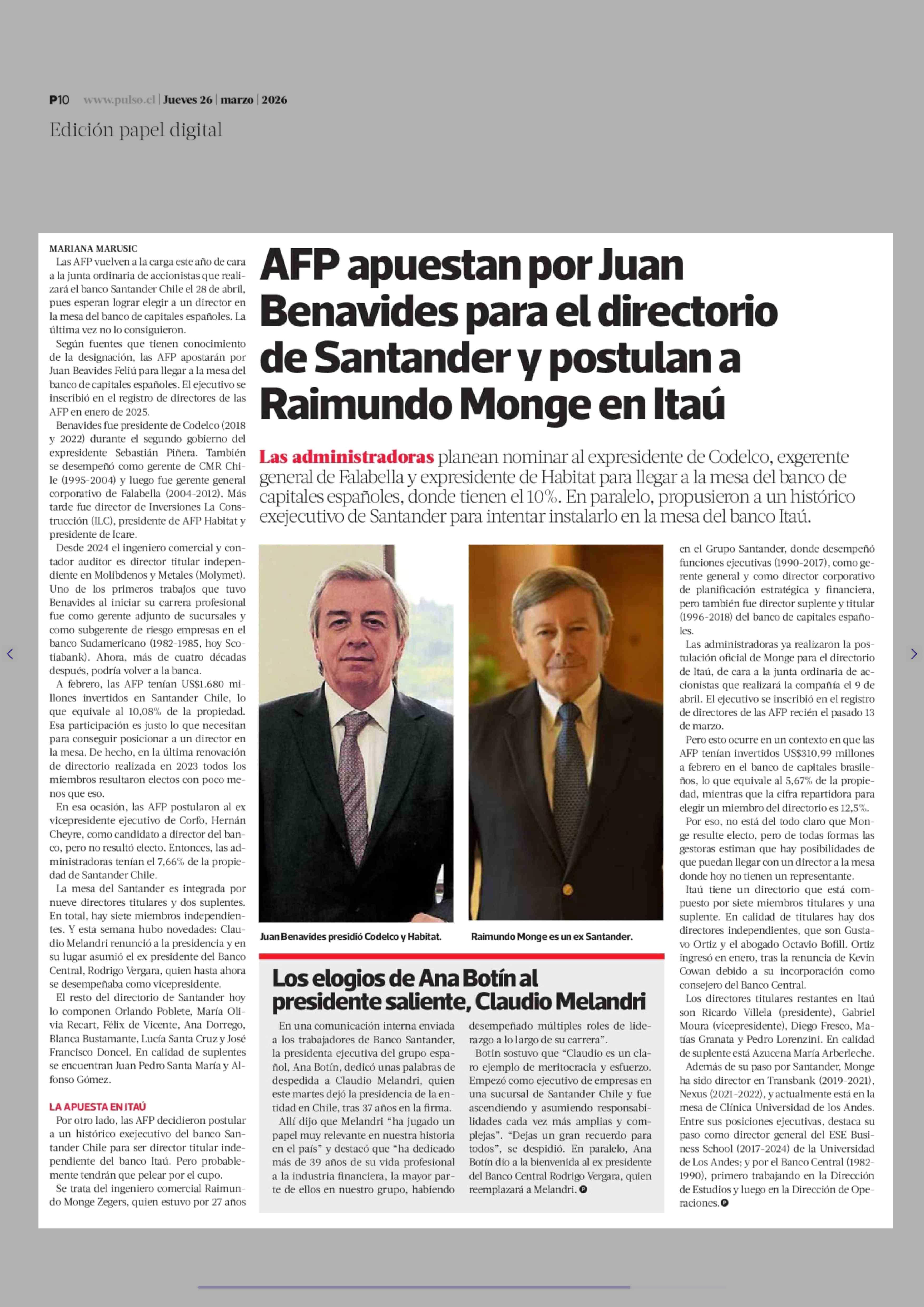 AFP apuestan por Juan Benavides para el directorio de Santander y postulan a Raimundo Monge en Itaú 26-03-2026 La Tercera |