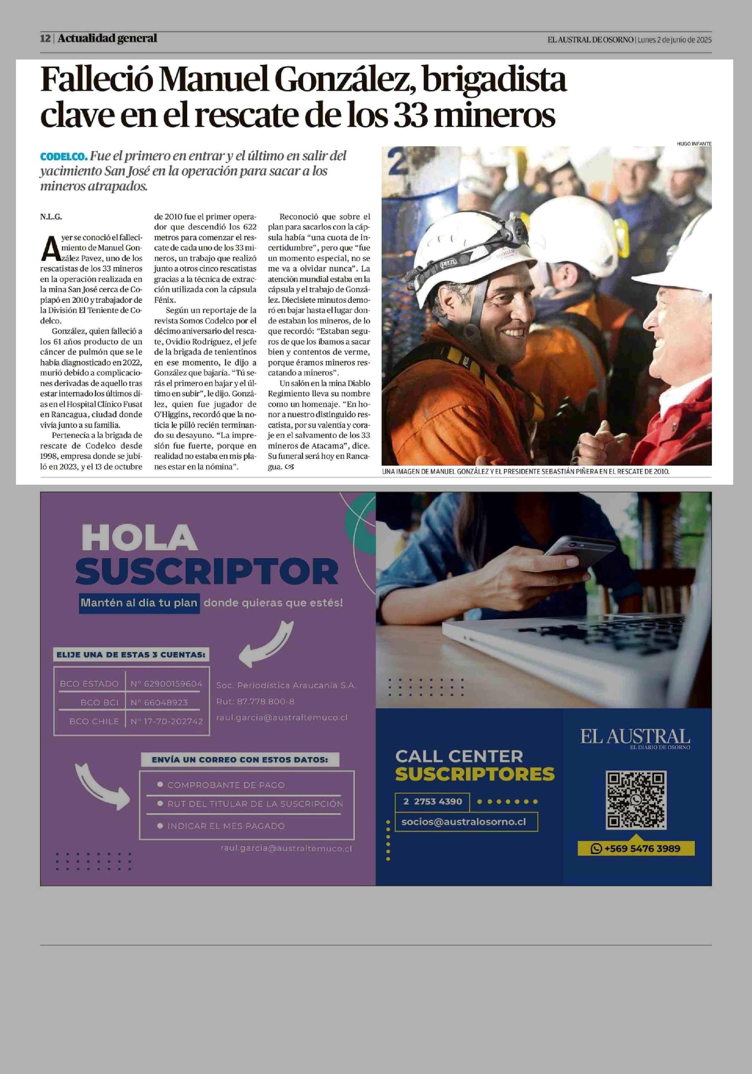 Falleció Manuel González, brigadista clave en el rescate de los 33 mineros 02-06-2025 El Austral de Osorno |