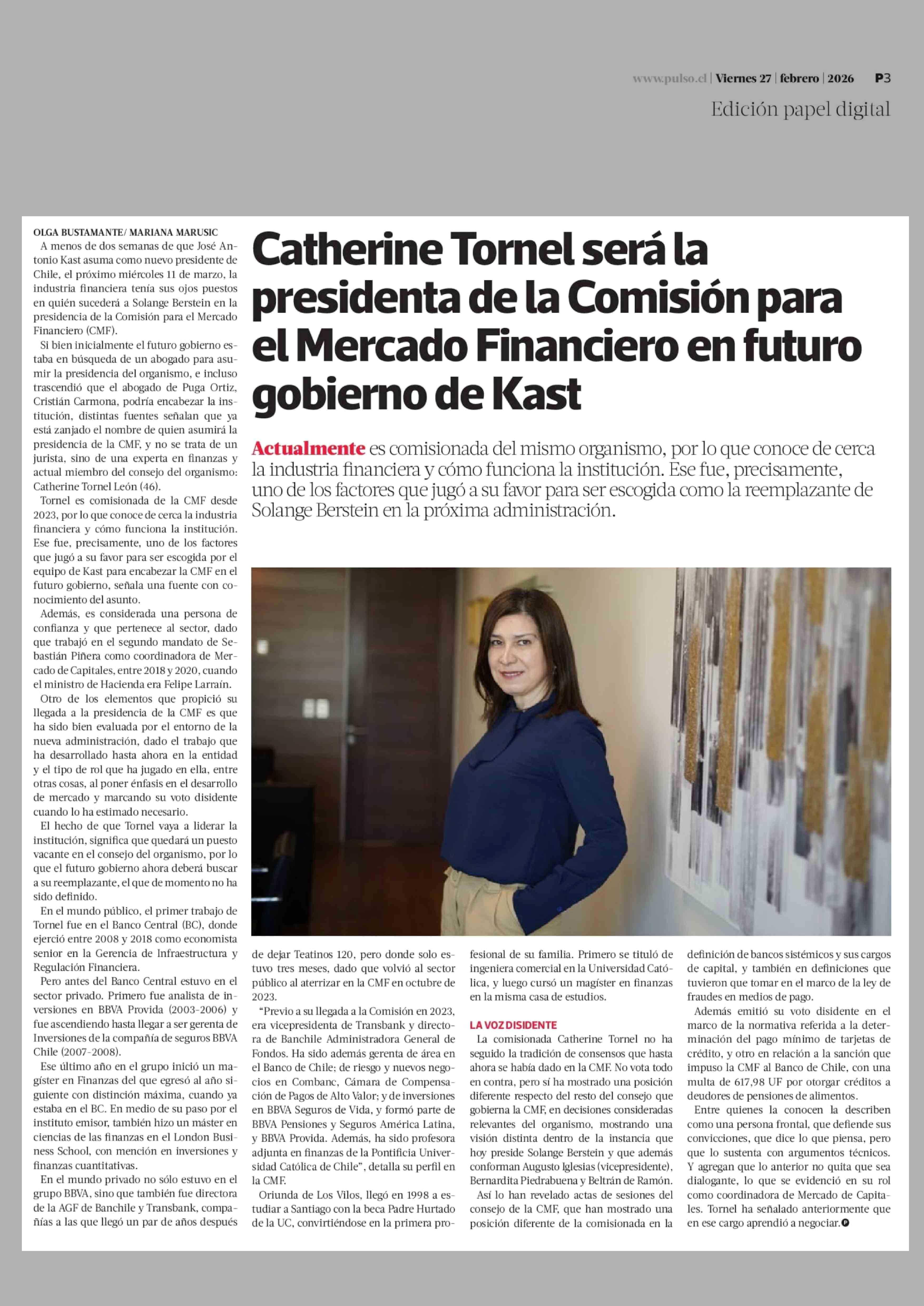 Catherine Tornel será la presidenta de la Comisión para el Mercado Financiero en futuro gobierno de Kast 27-02-2026 La Tercera |